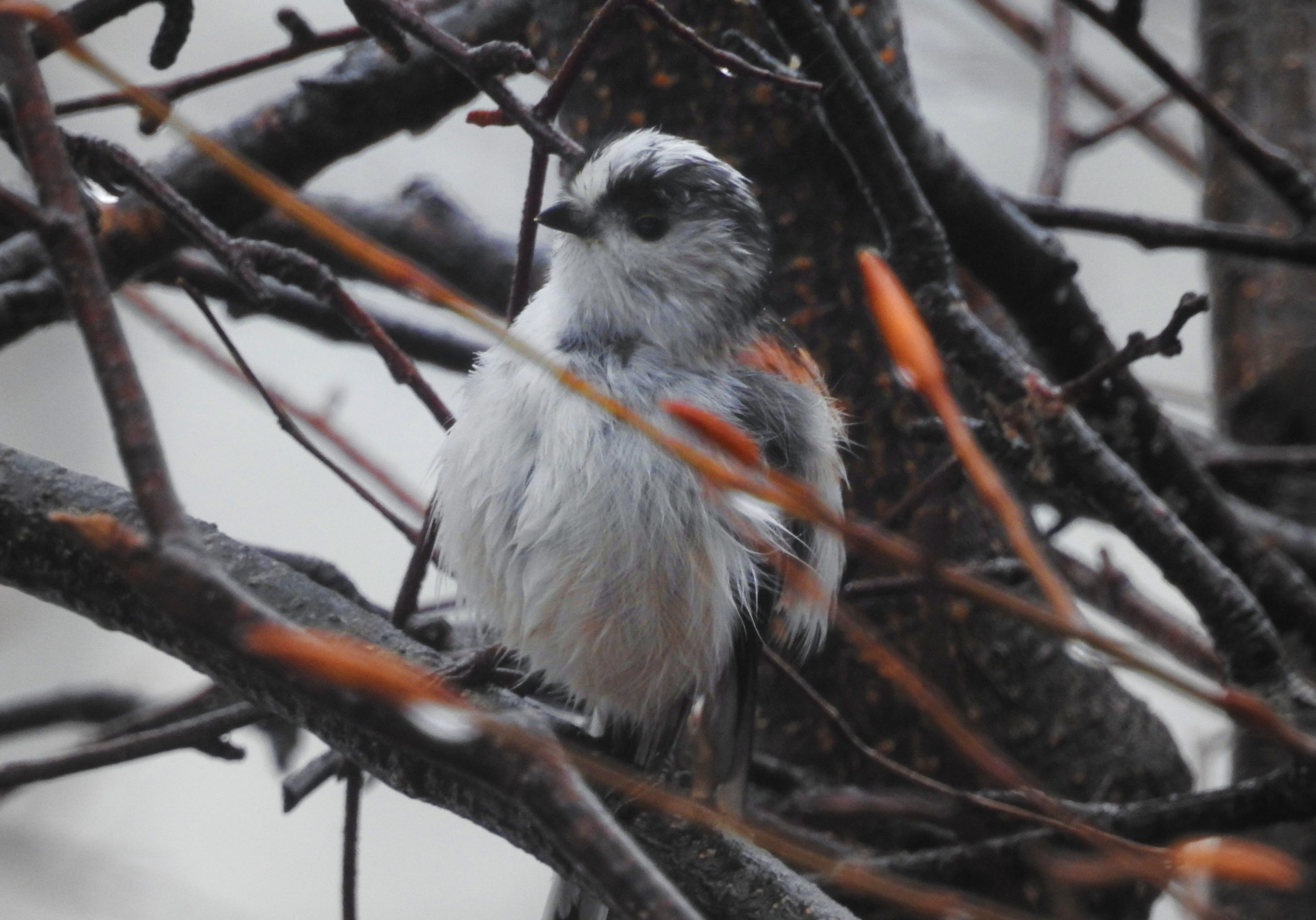 いつもはふかふか丸い体のエナガも雨の日は様子が違うようで・・・