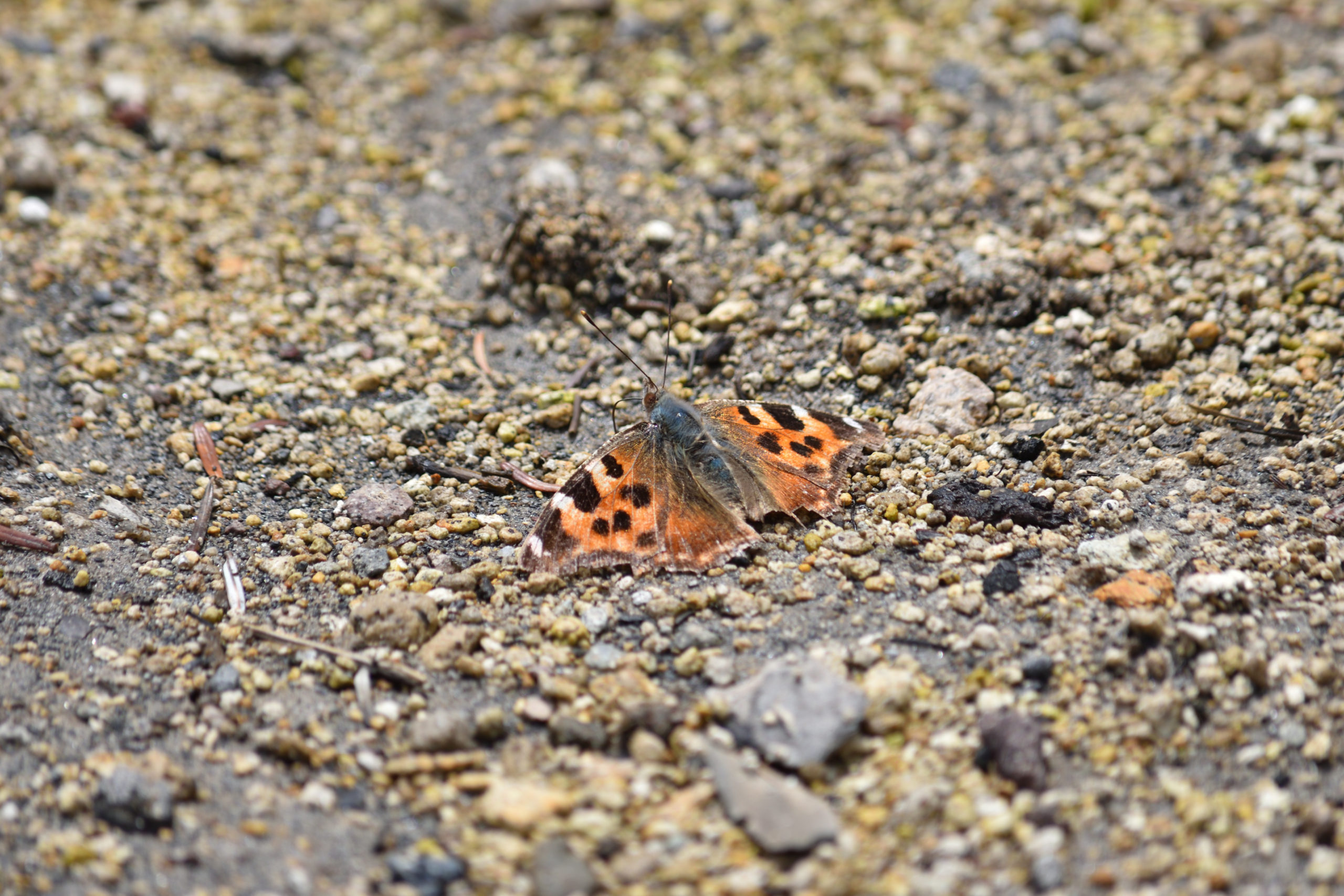 少し翅が欠けたエルタテハにも遭遇。吸水中です。この時期にはよく見る顔ですが、これも個人的にはうれしい出会い。