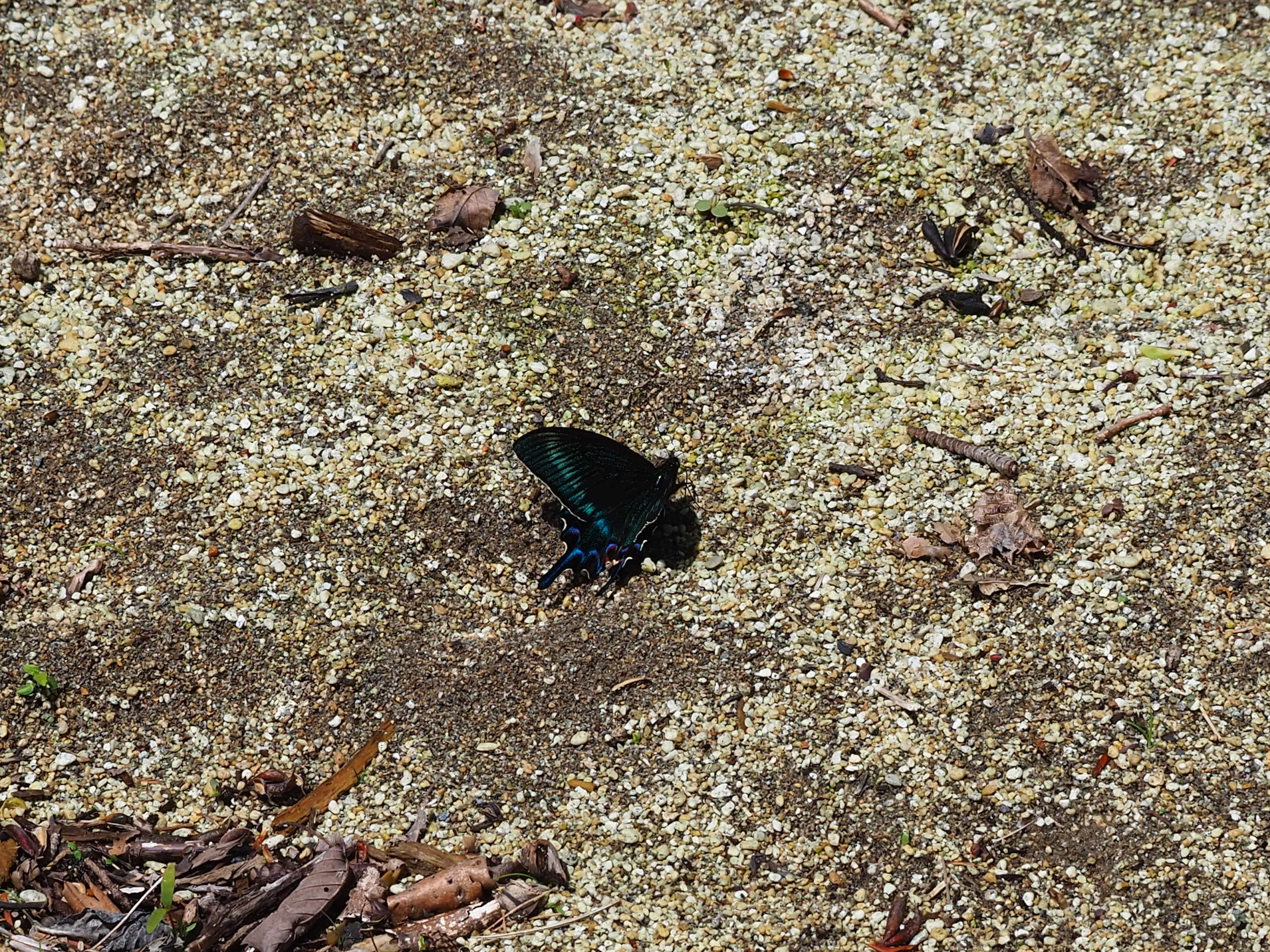 黒いチョウの正体は思った通り、ミヤマカラスアゲハ。少し飛び回った後、着地したため距離を詰めて観察できました。遠くへ飛び去ってしまうことも多く、今回は幸運でした!どうやら吸水中のよう。翅のあざやかな緑色の輝きもしっかり確認!