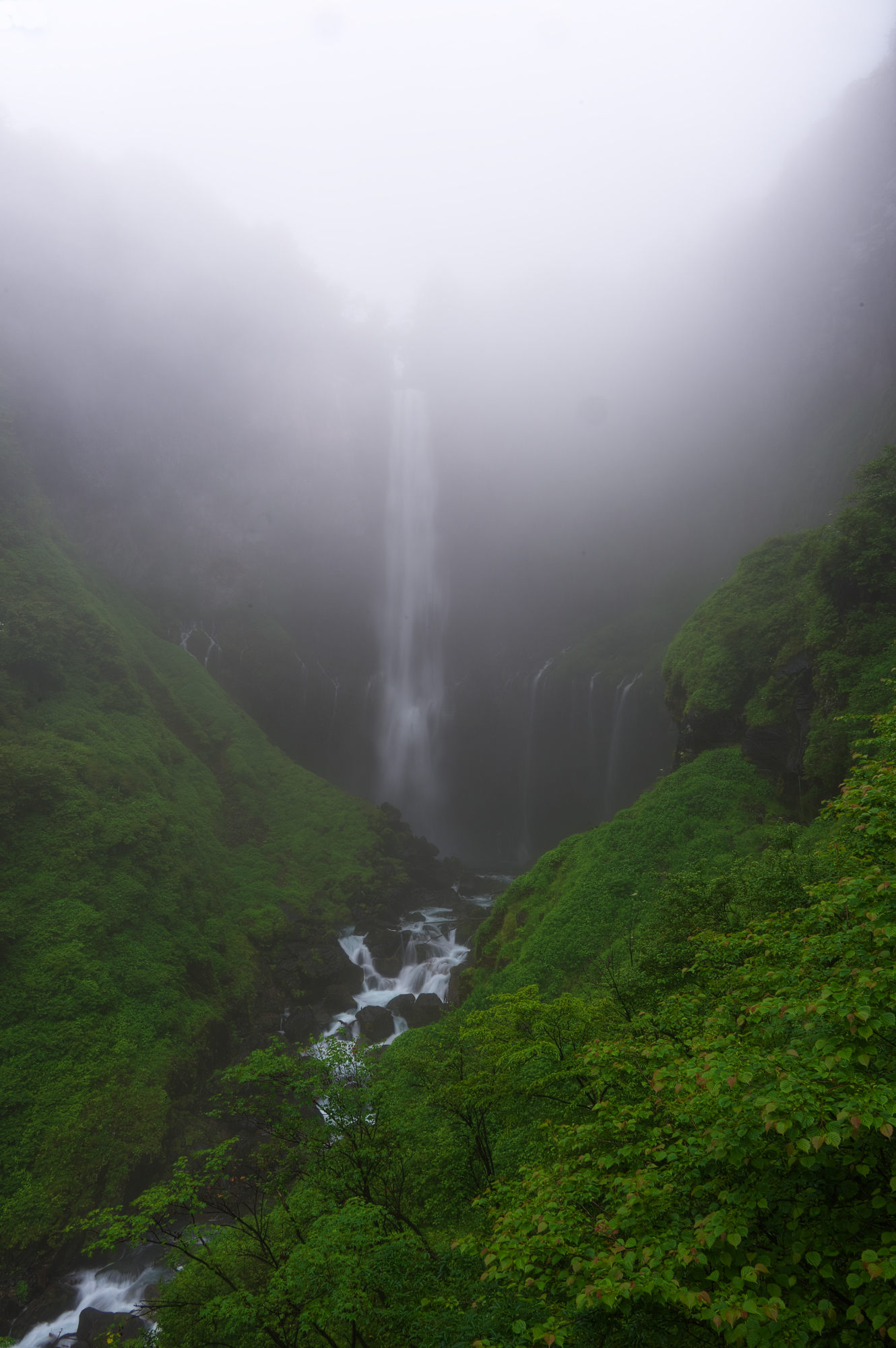 霧で滝の落ち口が見えないため、より大きな滝であることが強調されて見えますね。