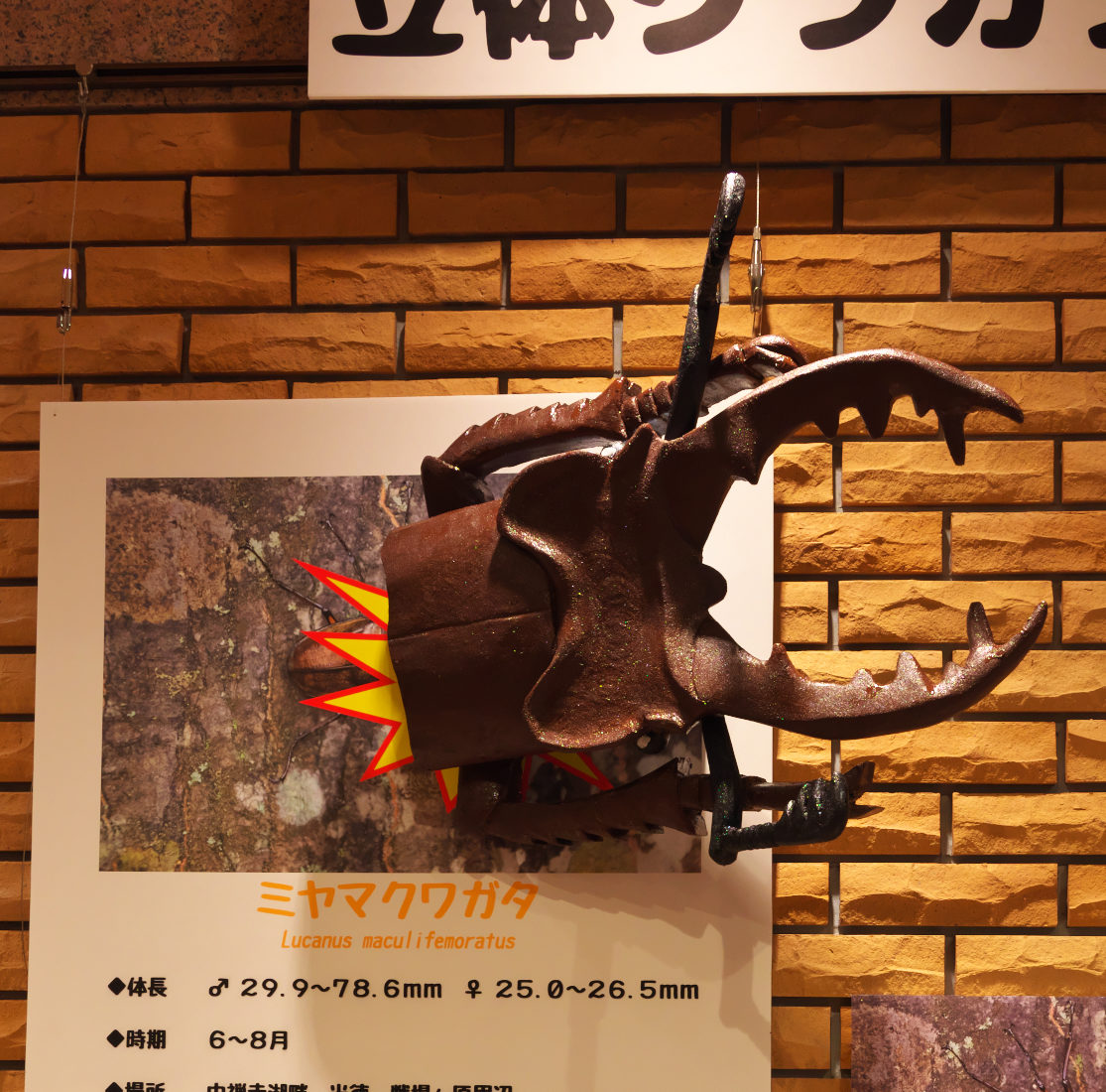 巨大なクワガタの立体模型(スタッフ手作り!!)です。それぞれのクワガタの特徴をできる限り再現しています。