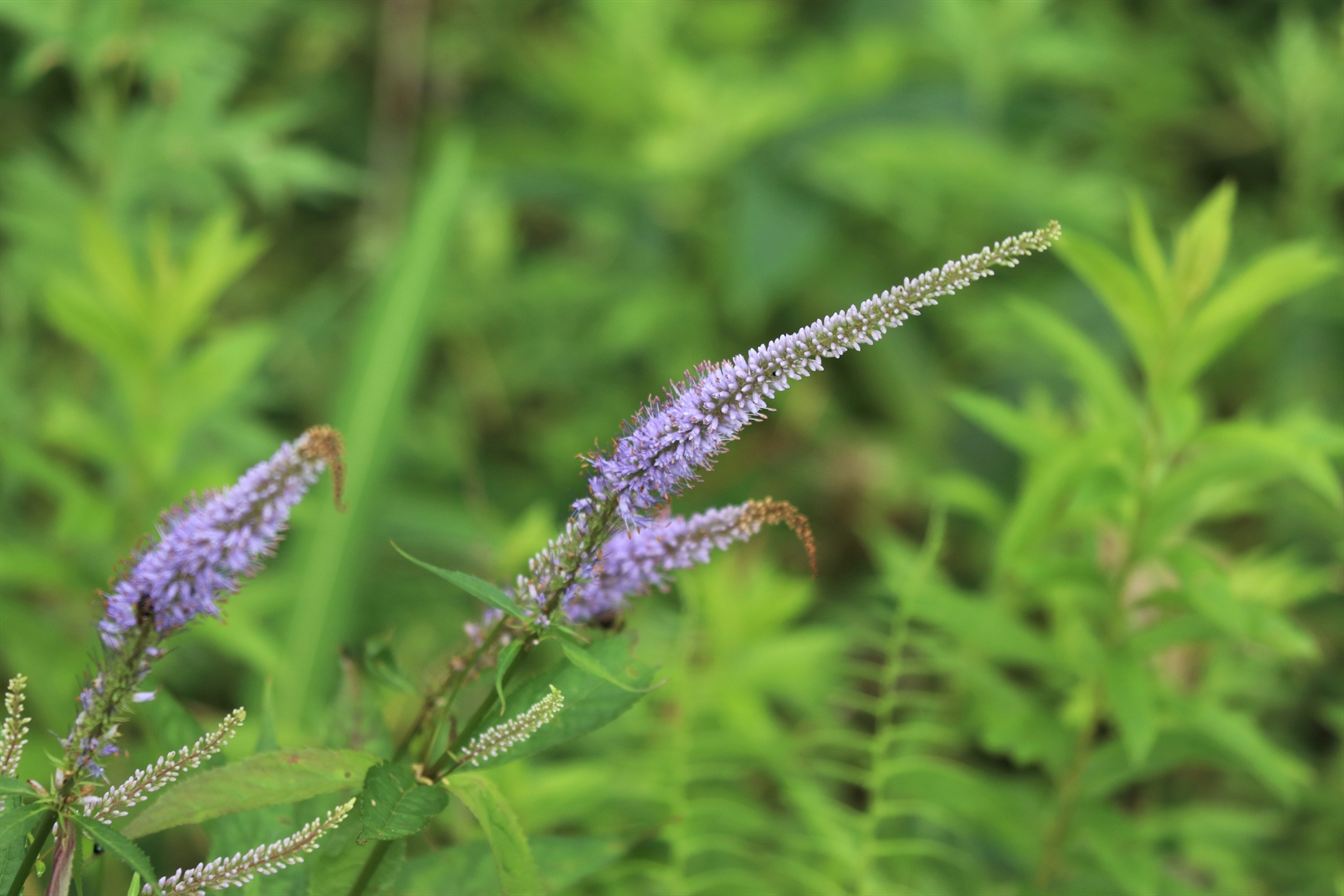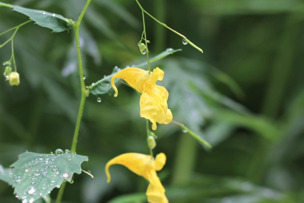 他にも天に向かってひょろひょろと伸びる青い花のクガイソウや、帆掛け船を吊り下げたような花の形のキツリフネなど、形が不思議で面白い花も咲き始めていました。