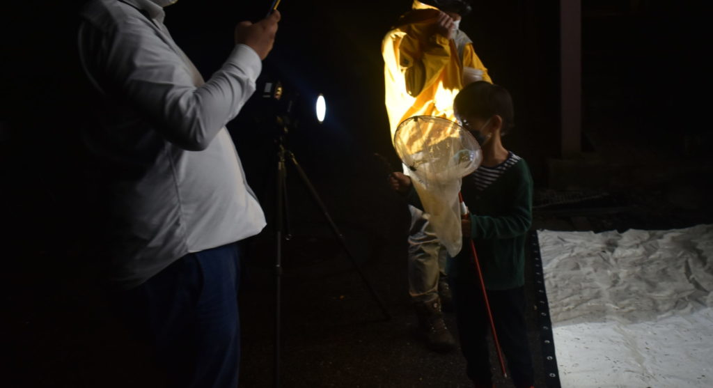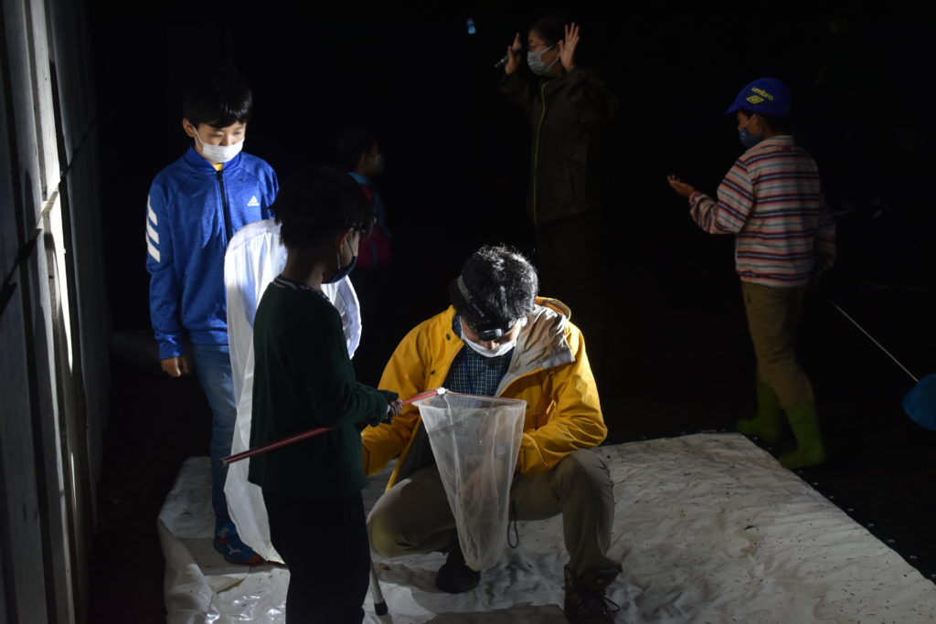 ライトトラップを行い、光に集まる昆虫を観察するイベント、時にクワガタも飛来します。