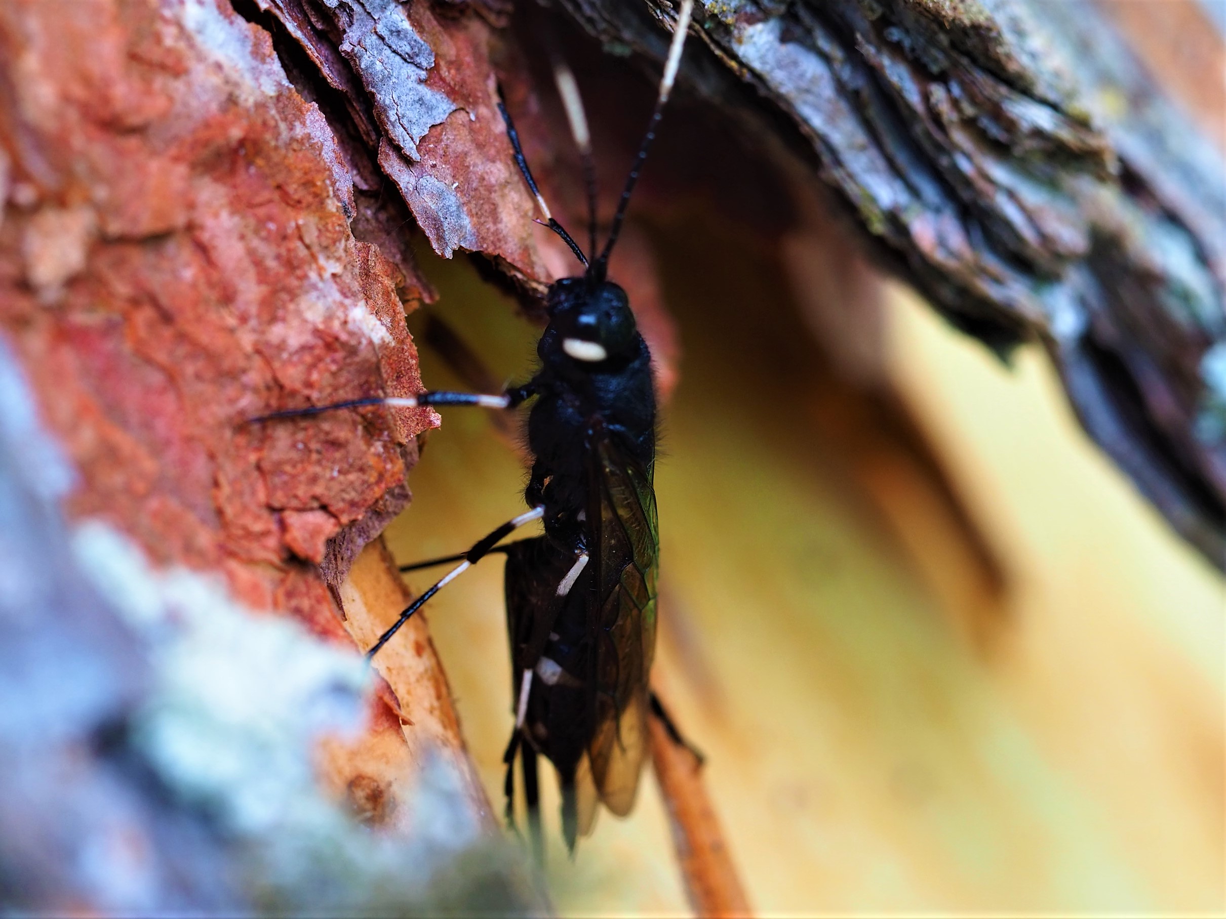 ヒゲジロキバチ。マツやモミなどの木の中に産卵します。産卵の瞬間までは残念ながら見られず。