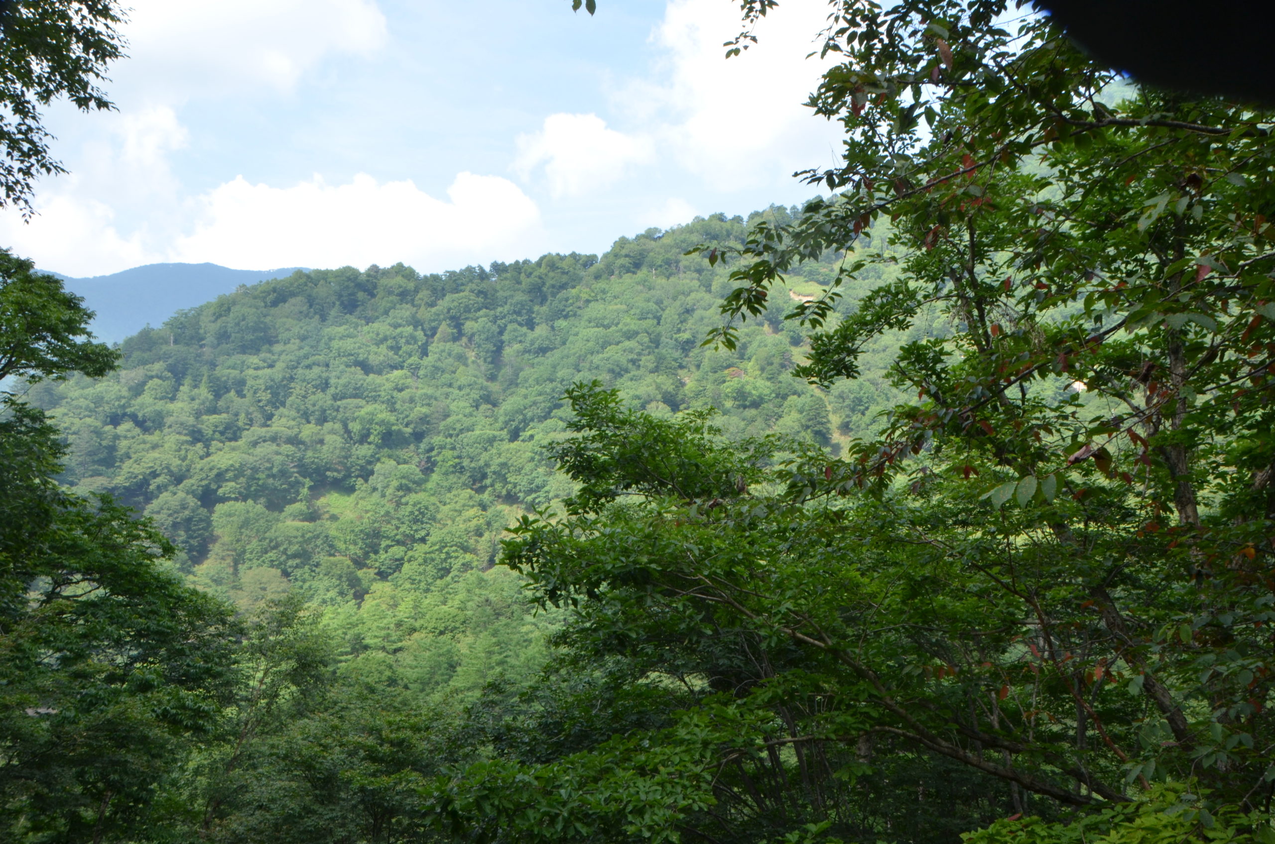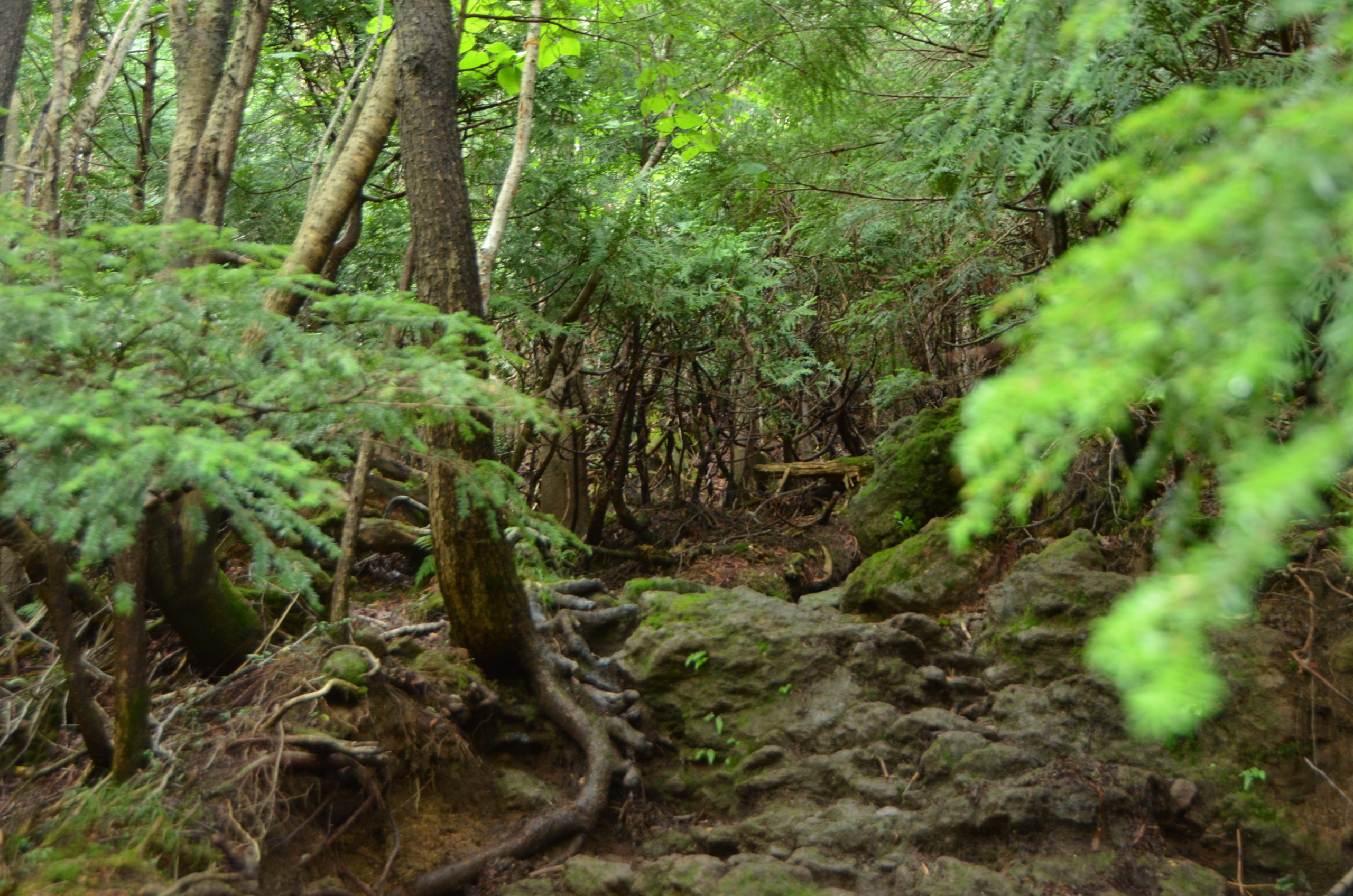 最初はミズナラなどの広葉樹やウラジロモミなどの針葉樹が入り混じったいわゆる山地帯の森です。これが標高1672mの小峠を越えるとガラッと変わりします。