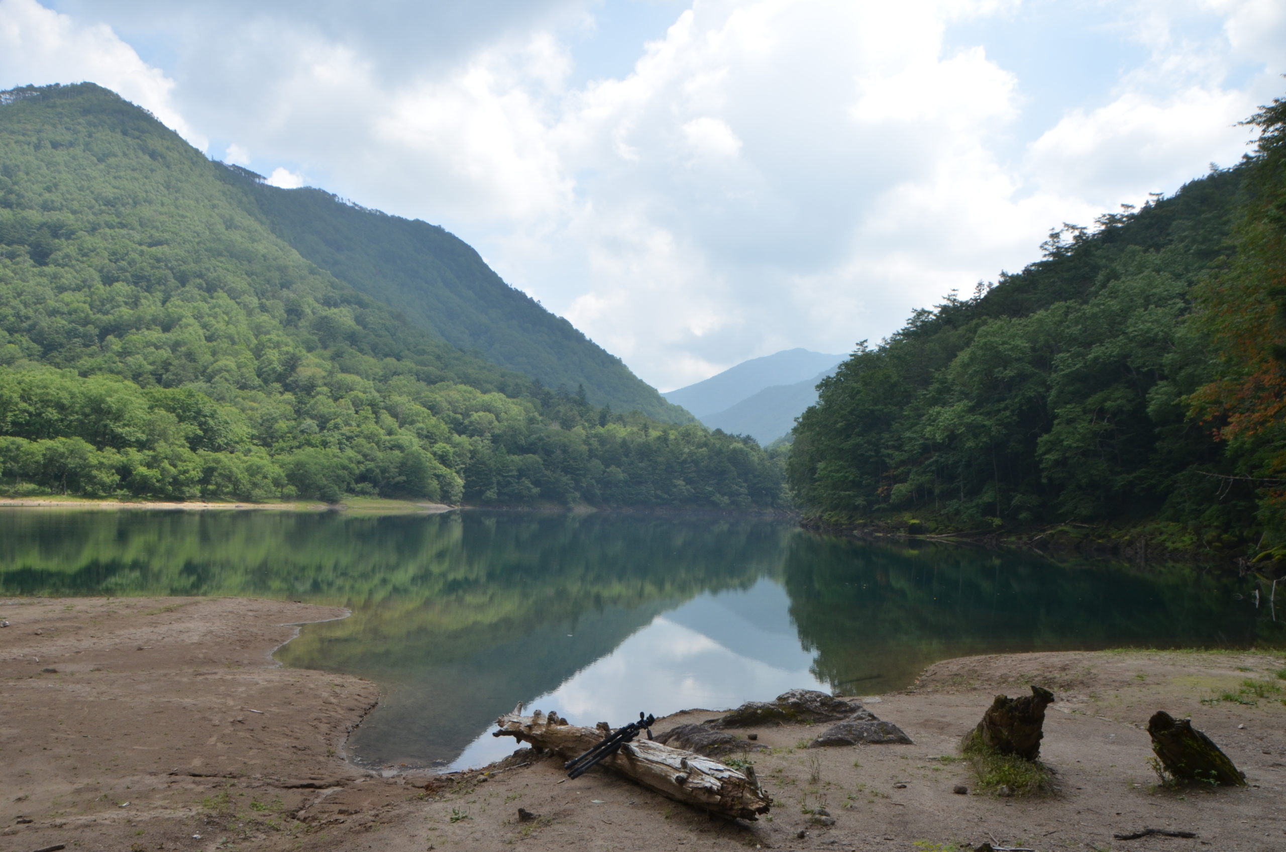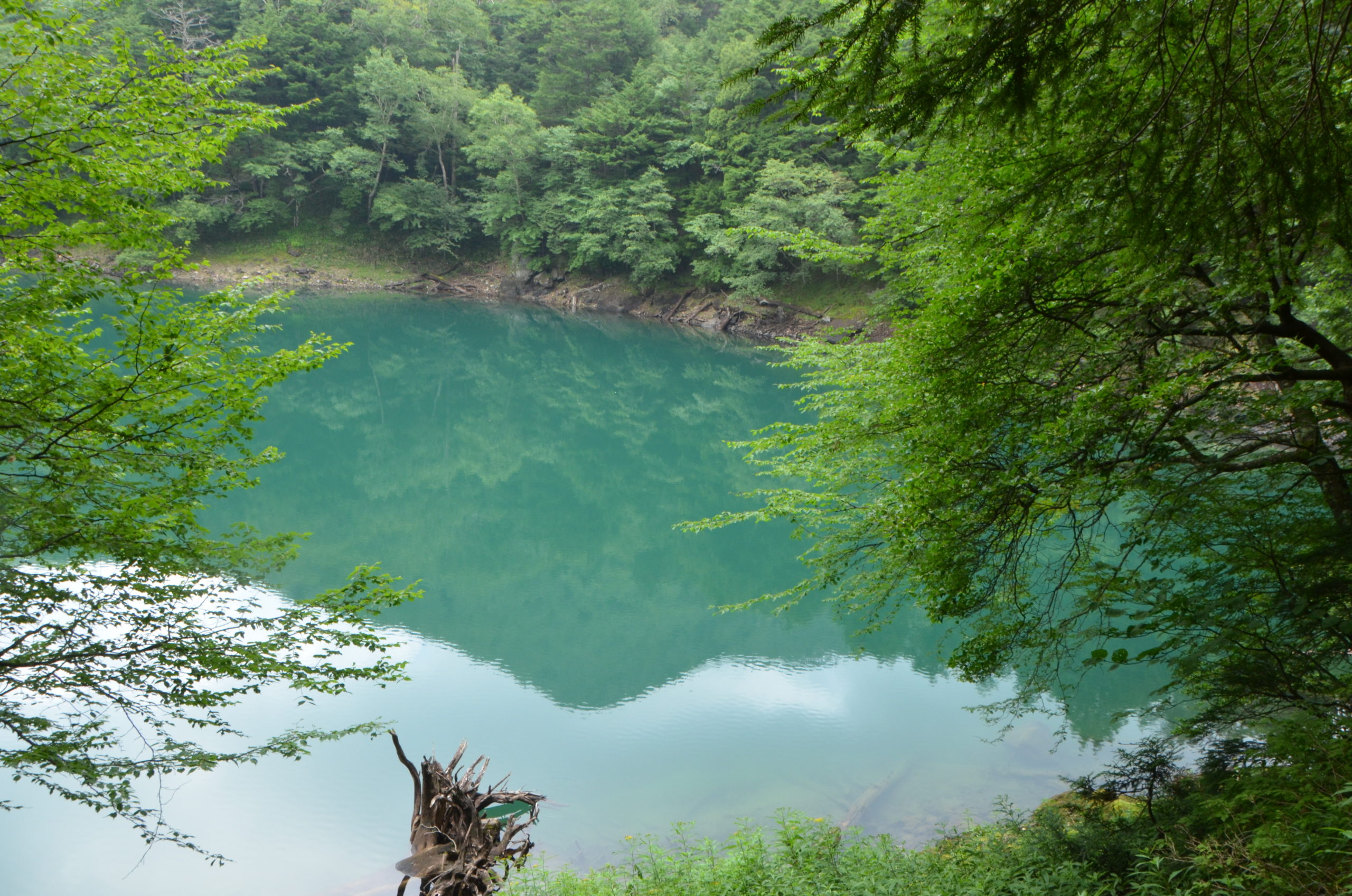 森の中から一転して目の前に大きくエメラルドグリーンの湖が広がります。青空によく似合う色です。初めて見る景色ではありませんが、雨空ばかりの時期が長かっただけに一層輝いて見えました。