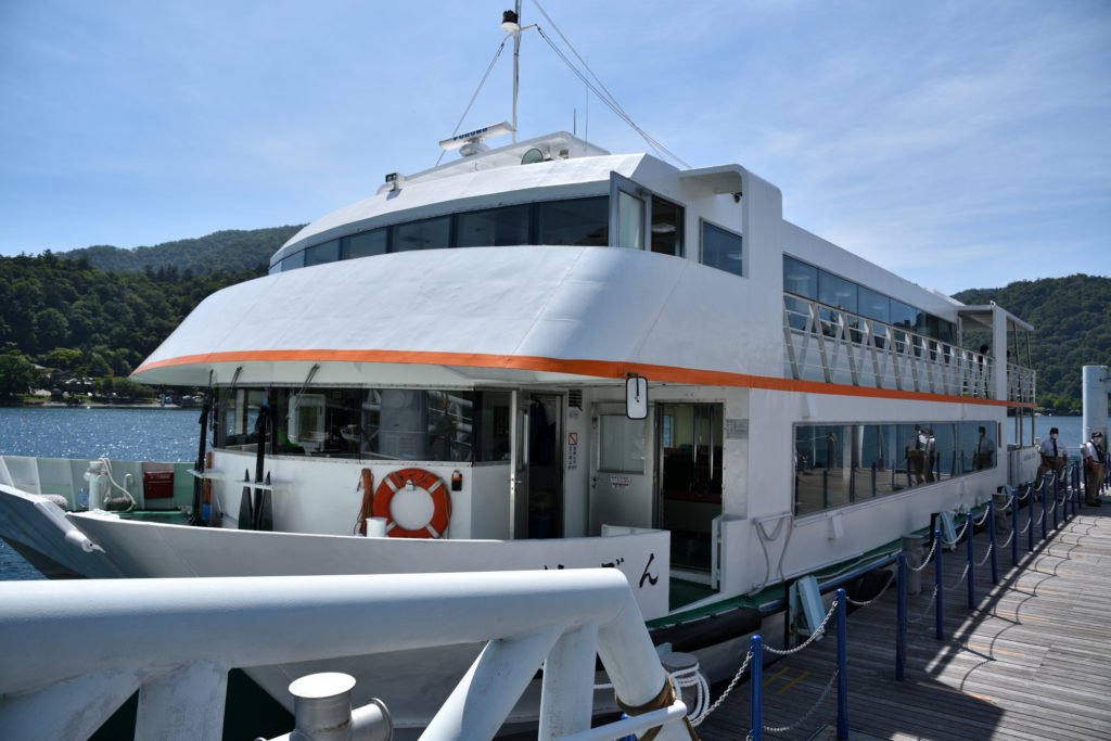「中禅寺湖一周コース」は、この豪華な二階建ての遊覧船に乗り、一時間程度で中禅寺湖の魅力をたっぷり味わえるコースです。