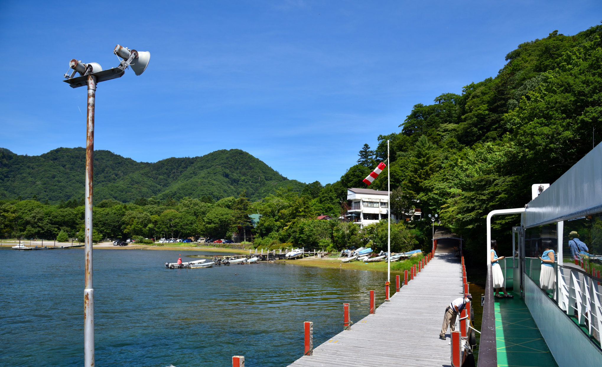 まずは船の駅中禅寺から20分ほどの菖蒲ヶ浜桟橋。