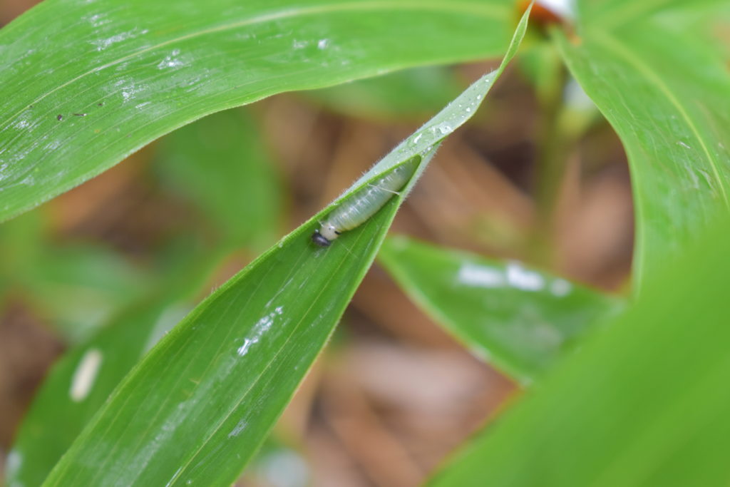 中にこんな薄緑色のイモムシがいることがあります。コチャバネセセリというチョウの幼虫です。