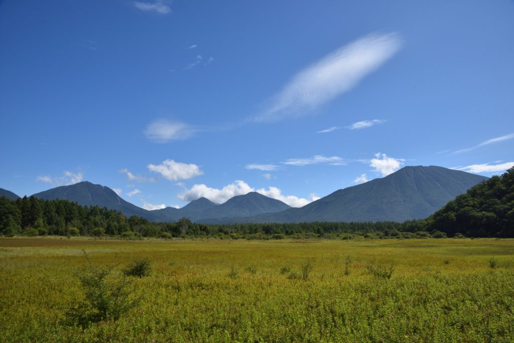 原の真ん中あたりに見えるのは、イネ科の植物の白い穂、ホザキシモツケなど様々な葉の緑。