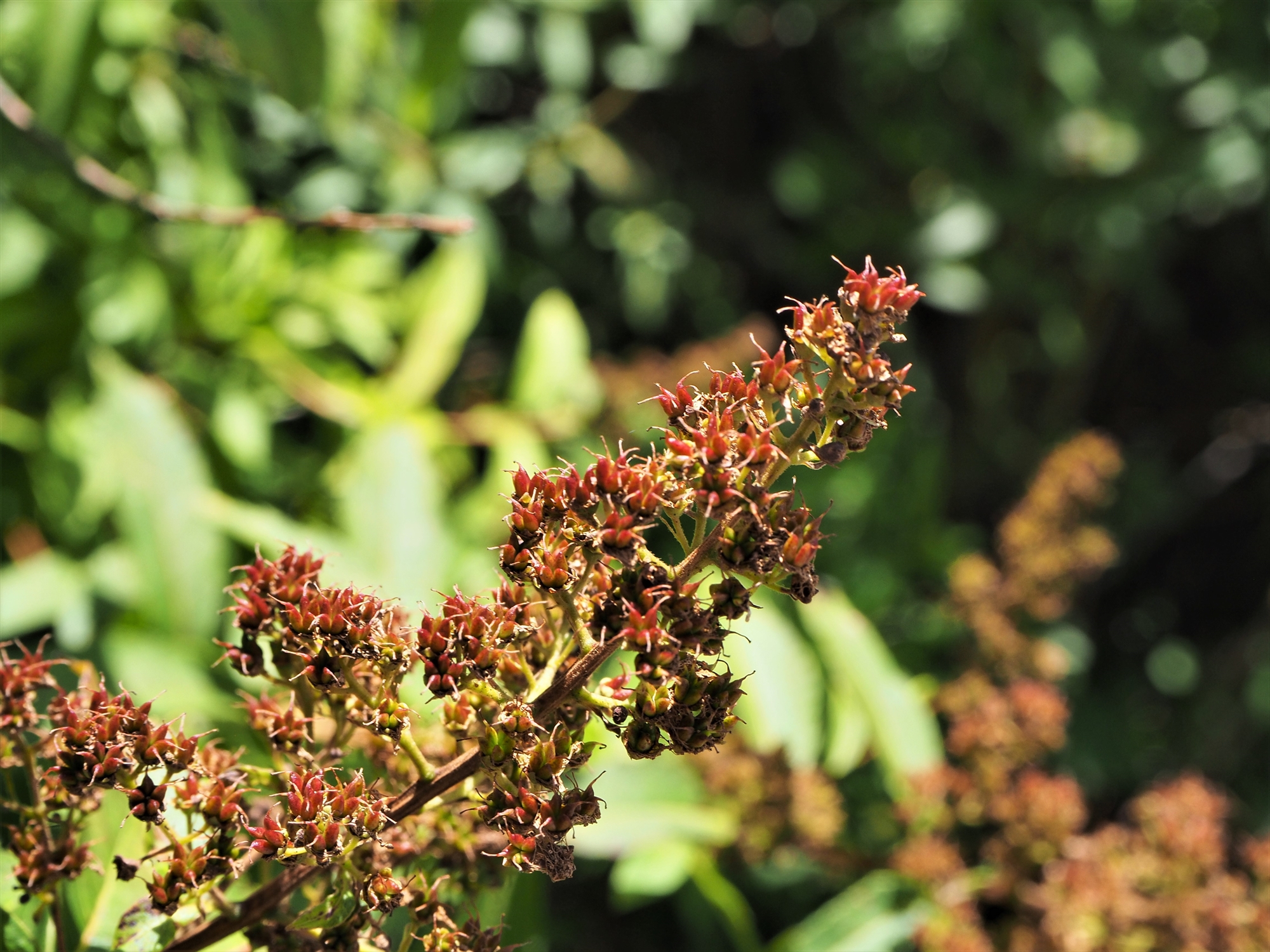 それに混じる赤茶は、ホザキシモツケの熟した実です。