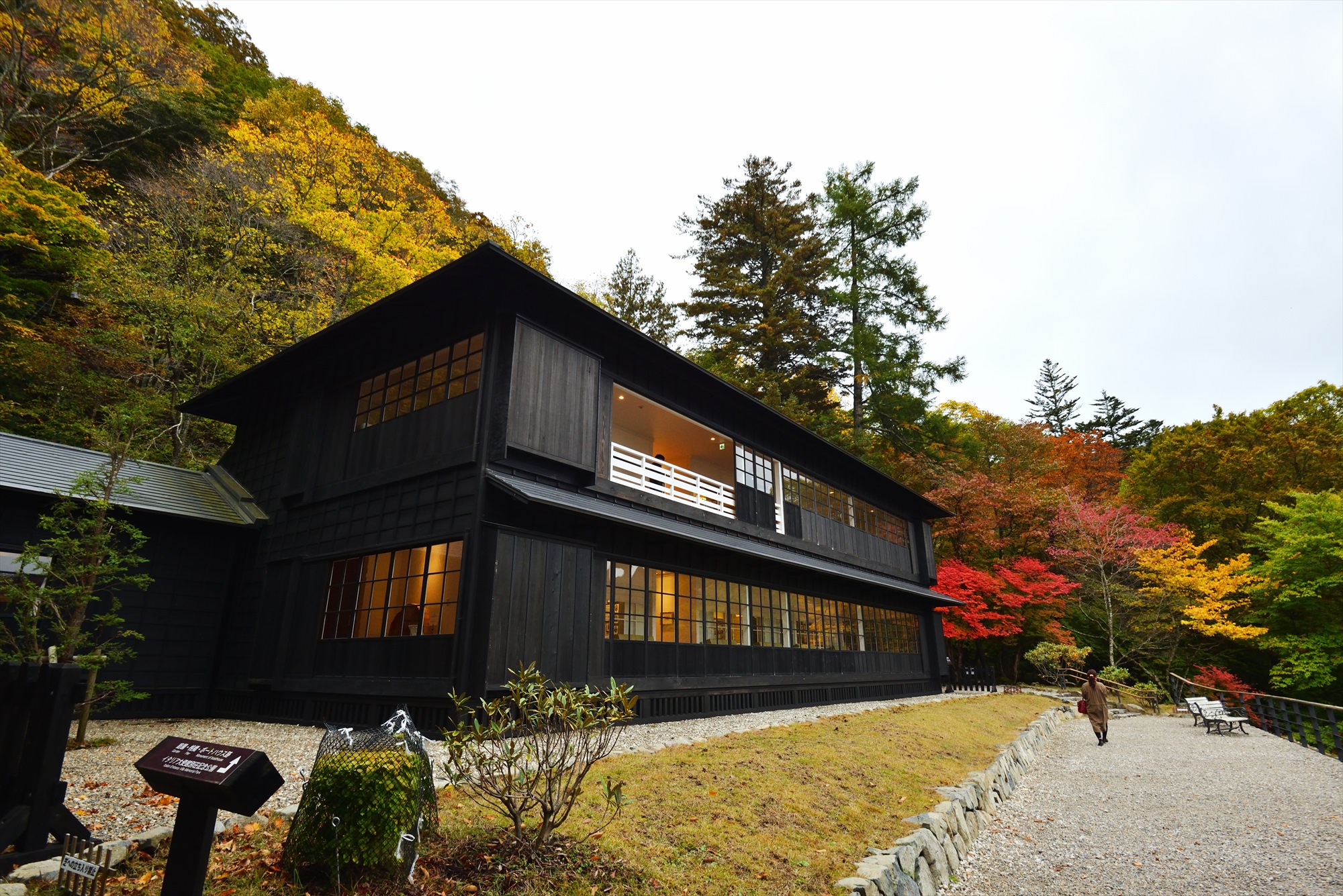 対岸に目を向けると鮮やかな赤と黄色が目に飛び込んできます