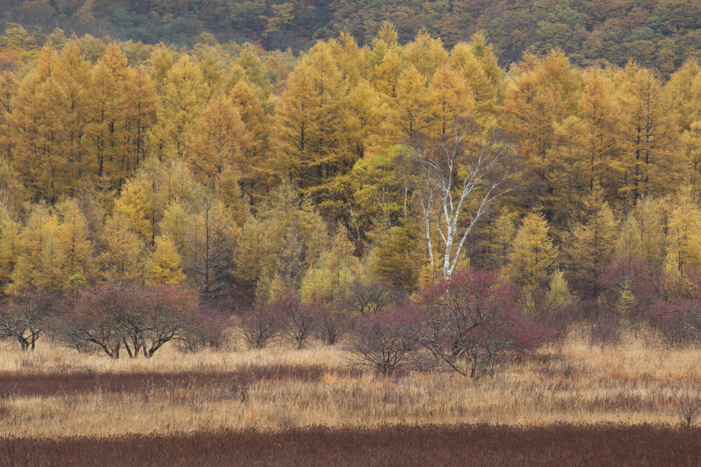 小田代原も見てきました。カラマツの黄葉がすすんでいます。まれにみる大豊作のズミの赤い実と相まって良い感じになってきています。