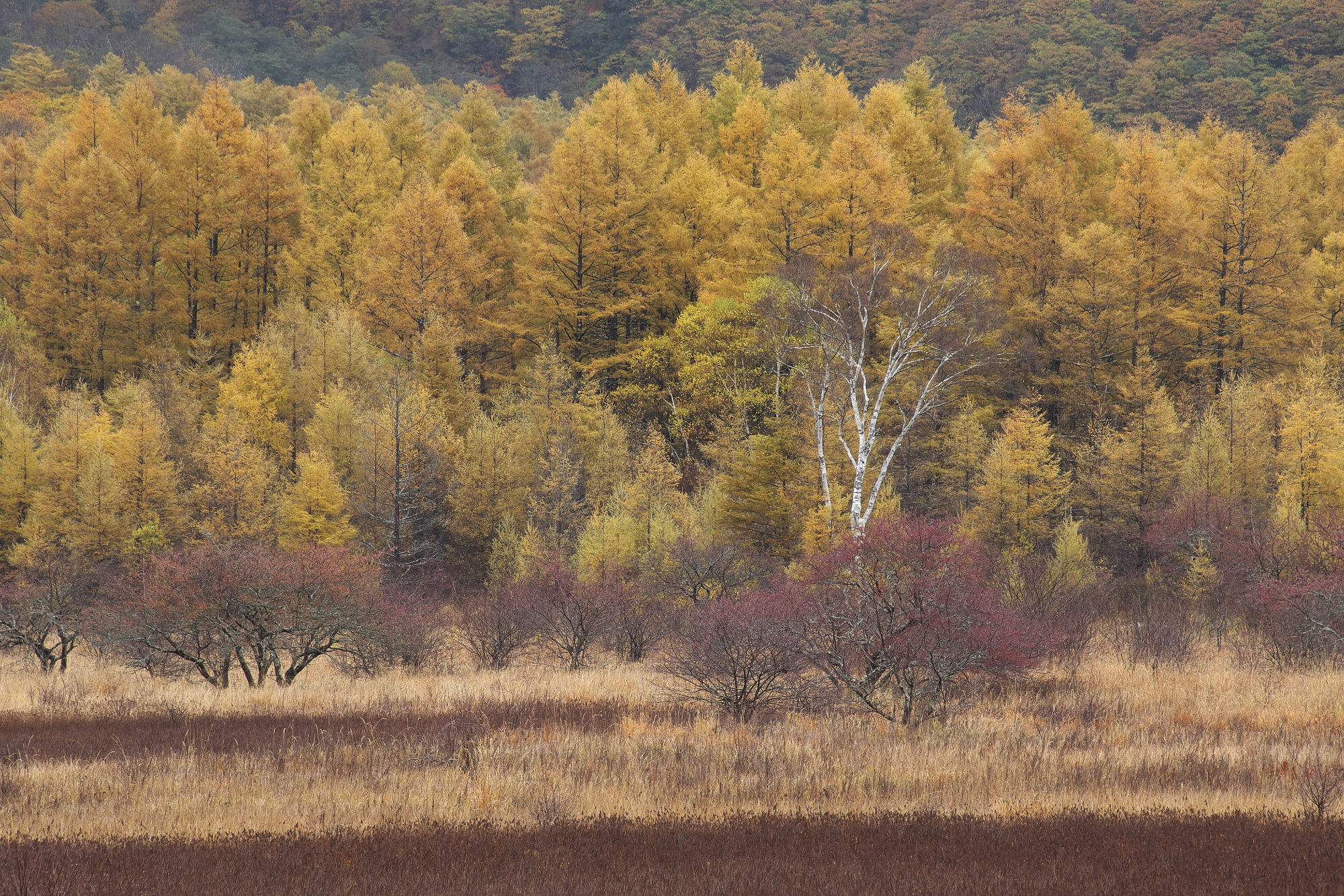 中段も茶色と黄色が主体となりミズナラなどの落葉が進んでいます。個人的にはこれくらいのトーンも大好物ですが、おそらく世間一般でいう紅葉は終わってきたというところでしょう。
