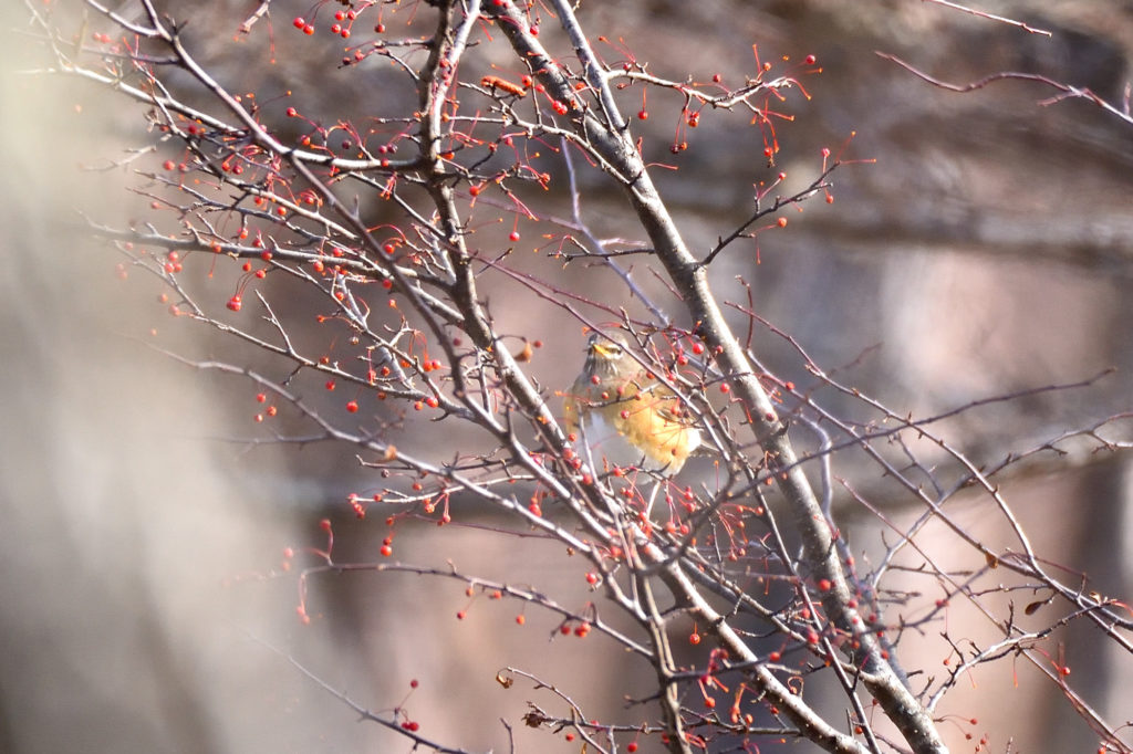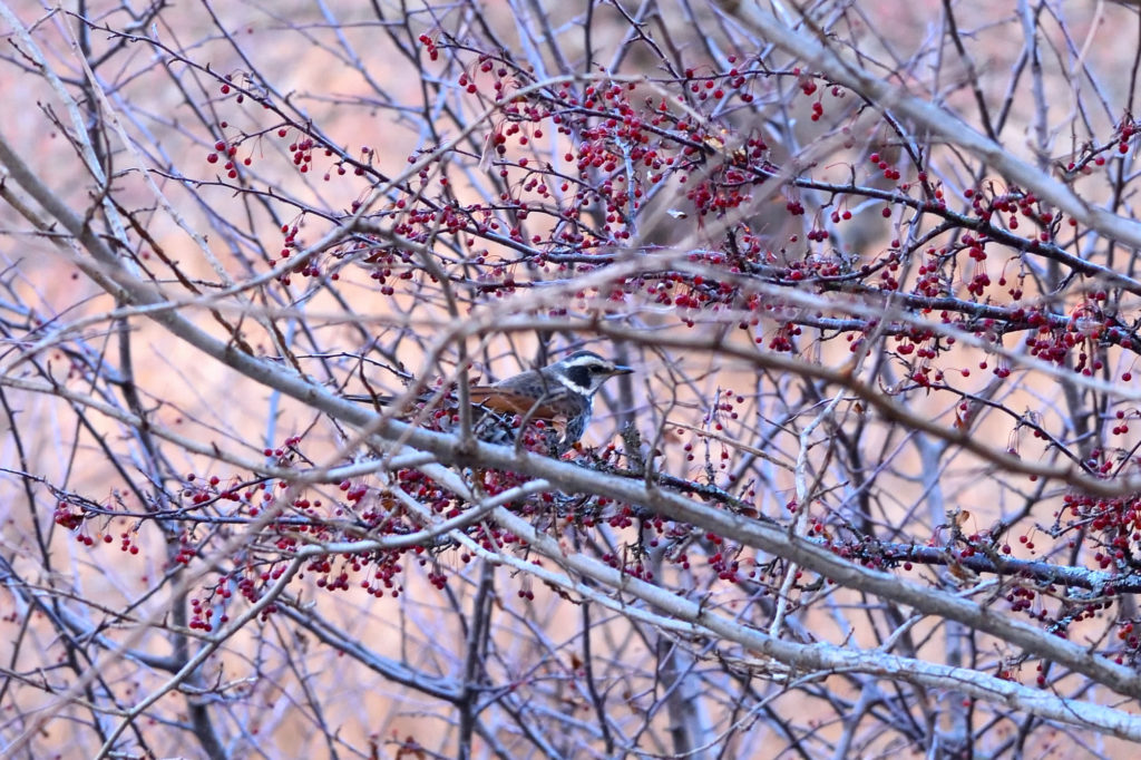 テンやキツネ、野鳥たちにとっては大切な食糧で、ズミ林は大人気の食事処です。特に1ヶ月ほど前から渡来し始めた冬鳥たちも賑やかに鳴き交わしながらついばんでいます。