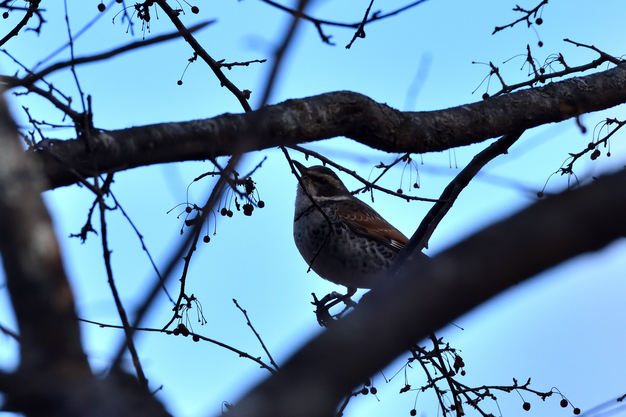 しがみついたズミの細い枝がたわんで仰向けになり、折れるか落ちるかの危ういバランスにも見えましたが、本鳥は気にした様子もありません。木の幹に難なくしがみつける力強い脚を利用した、上手ですがちょっとお行儀の悪い食事現場でした。