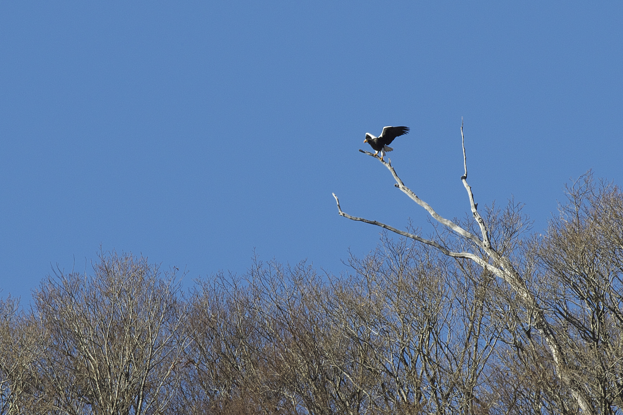 その後、オオワシはボートハウス近くの山の稜線に止まると、もう一度飛び立ち木に止まるを繰り返し、山の裏側へと姿を消しました。