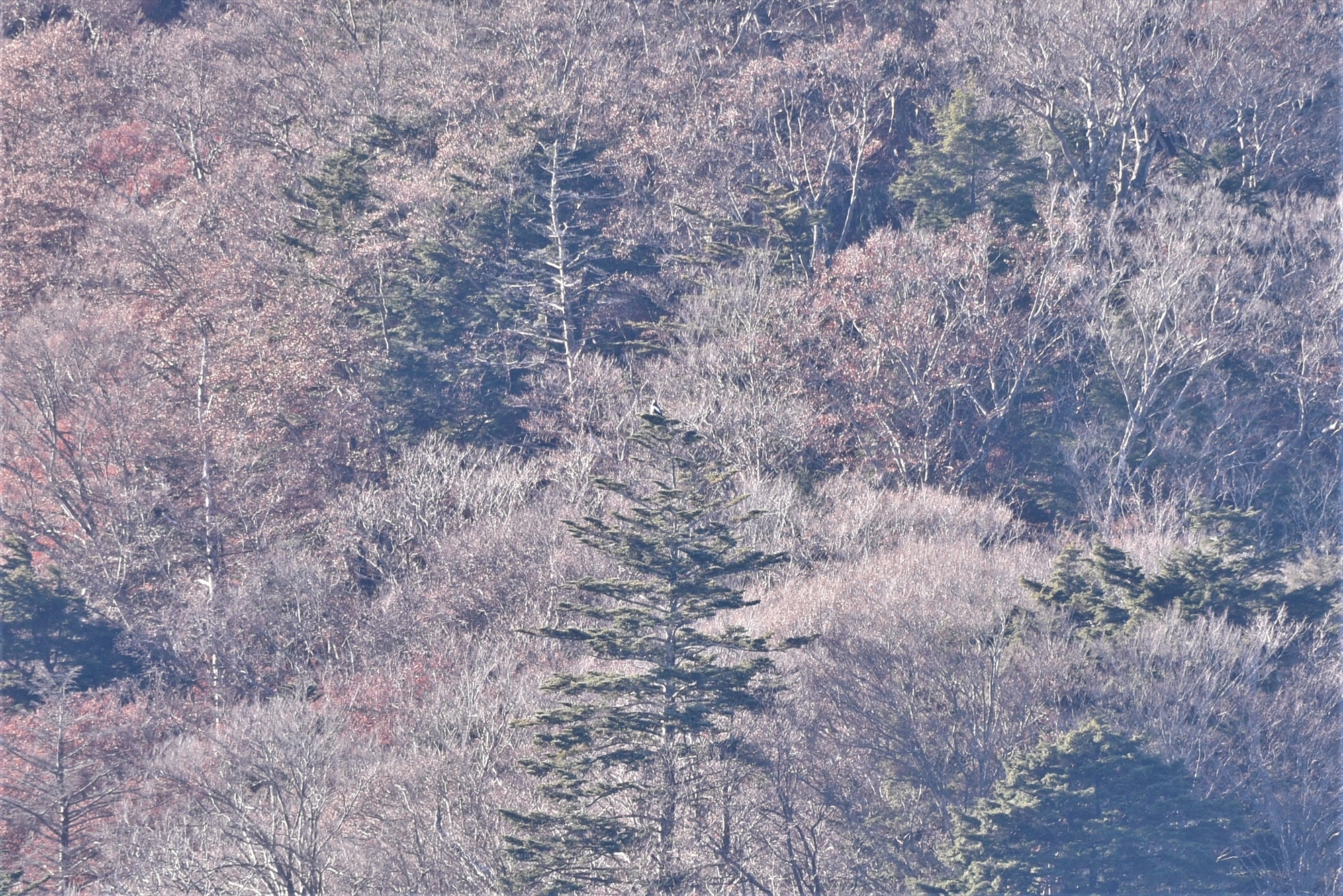 実はイベント開催時間前より、対岸の中腹あたりのモミの木に止まっているのが確認できました。