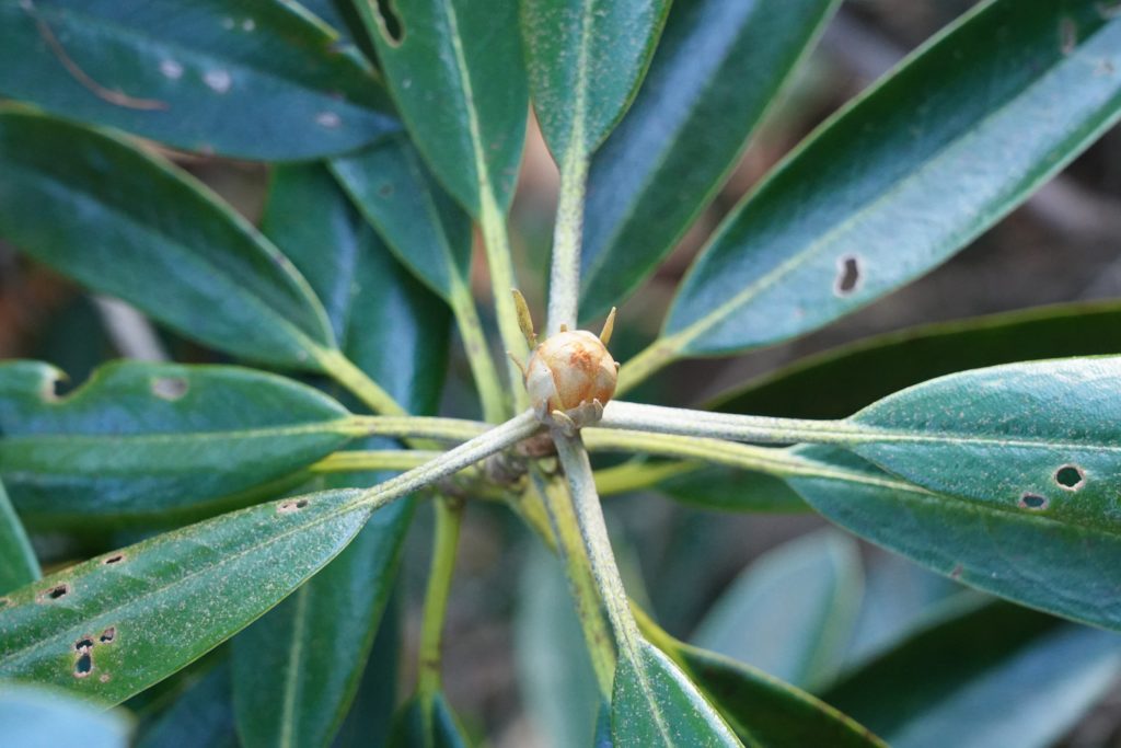 例えば5月頃から花の見ごろを迎えるアズマシャクナゲ。開花まで半年近くあるこの時期から既につぼみが付いています。