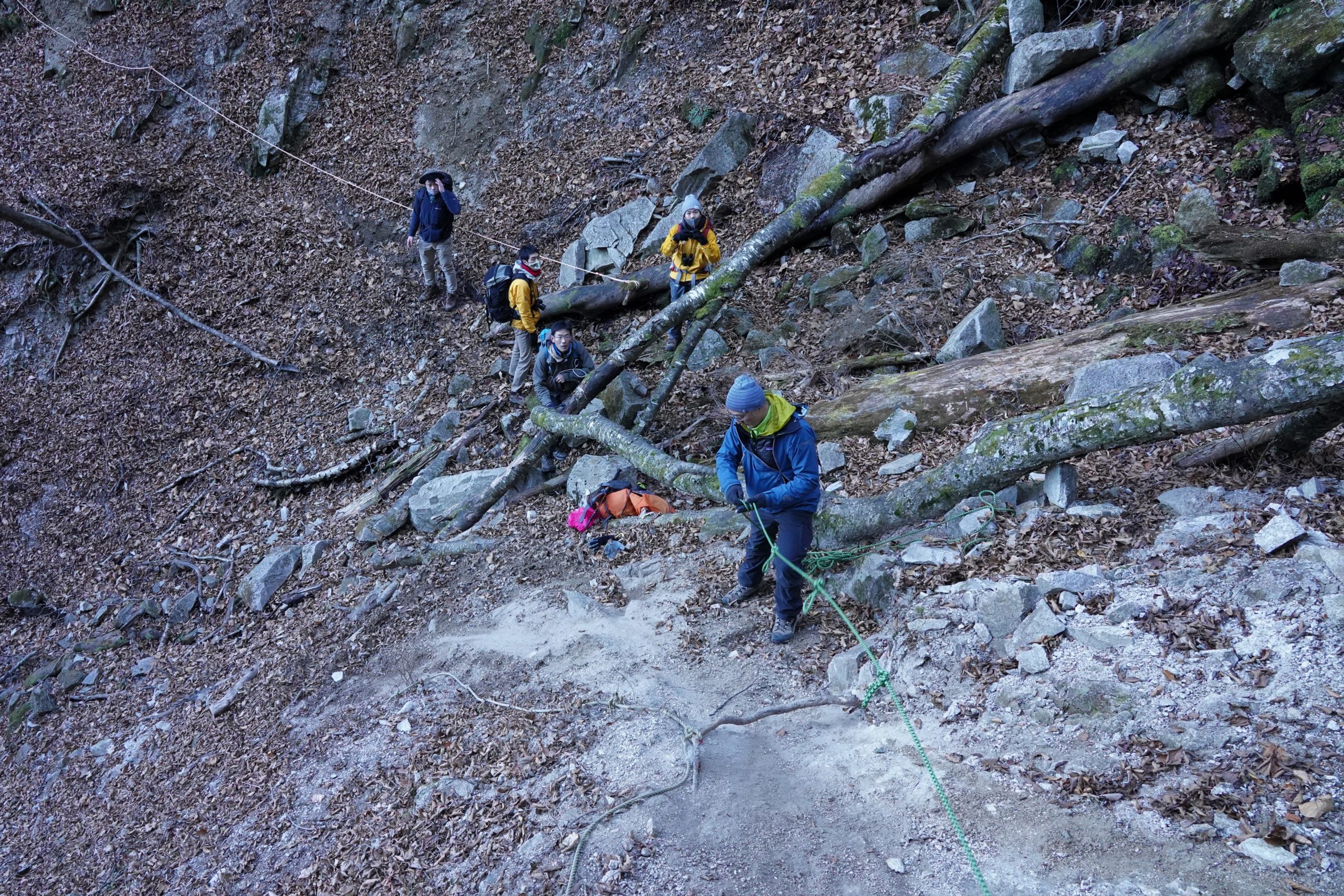 ロープを使用して登り降りを行う斜面