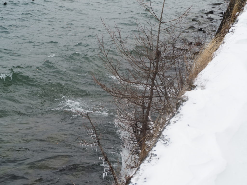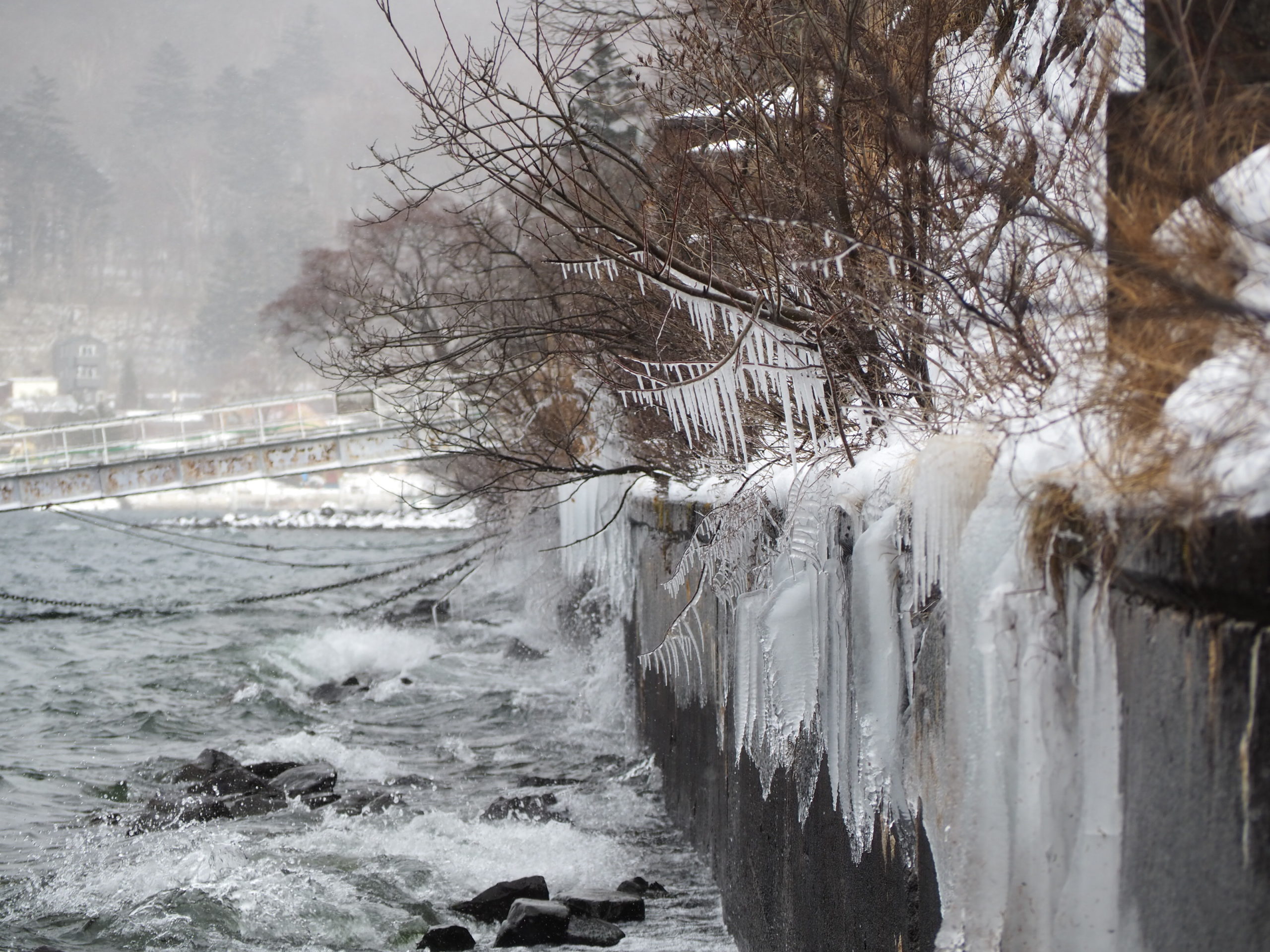 低い位置にですが、駐車場の手すりの外側に冬の名物、しぶき氷ができていました。中禅寺湖の水が少ないため、風があってもしぶきがさほど上までかからないようです。