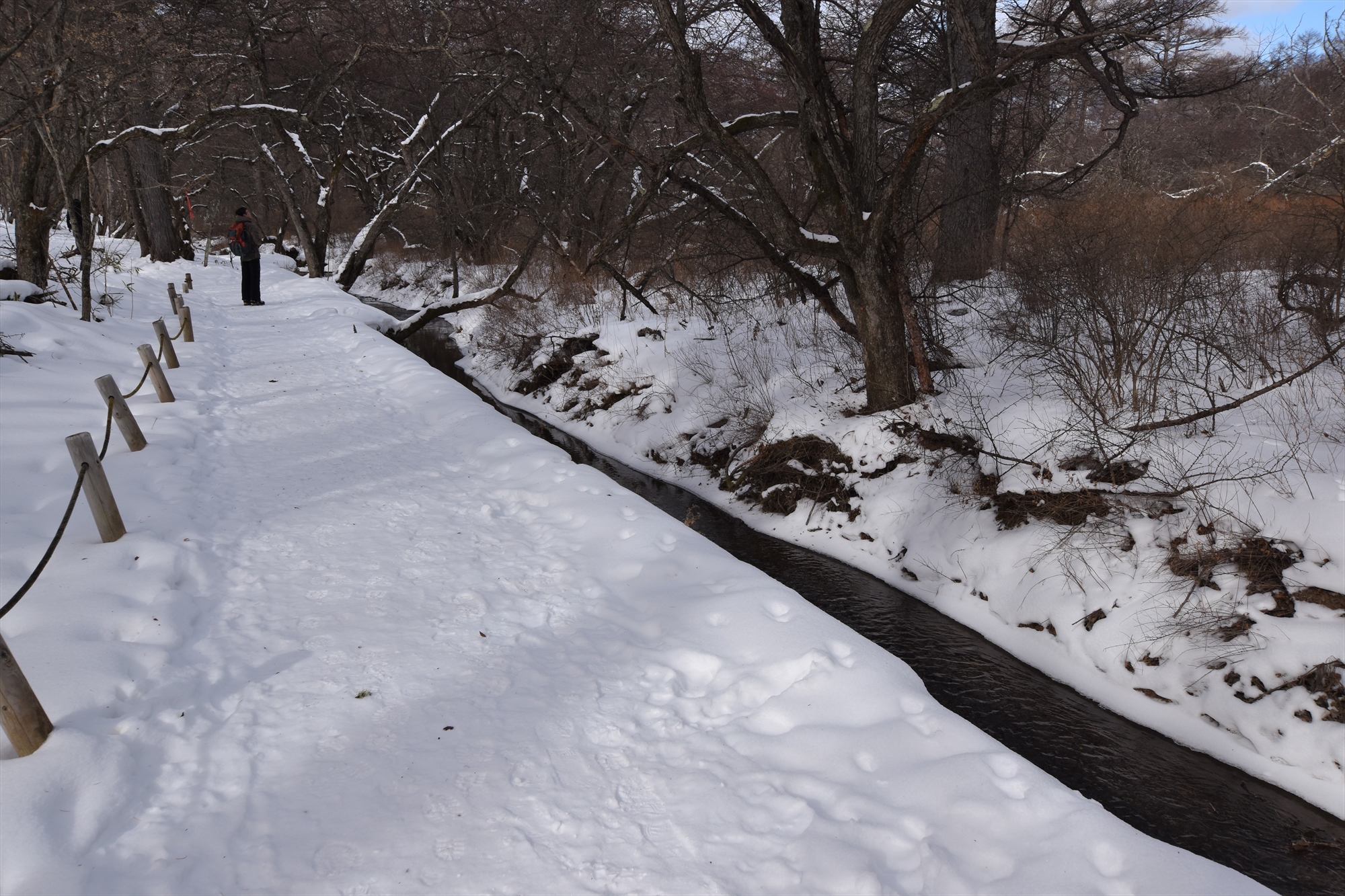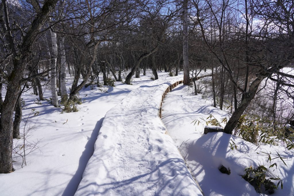 積雪は20㎝ほどで、こちらも道の中心は踏み固められており、トレッキングシューズでも問題なく歩くことができます。