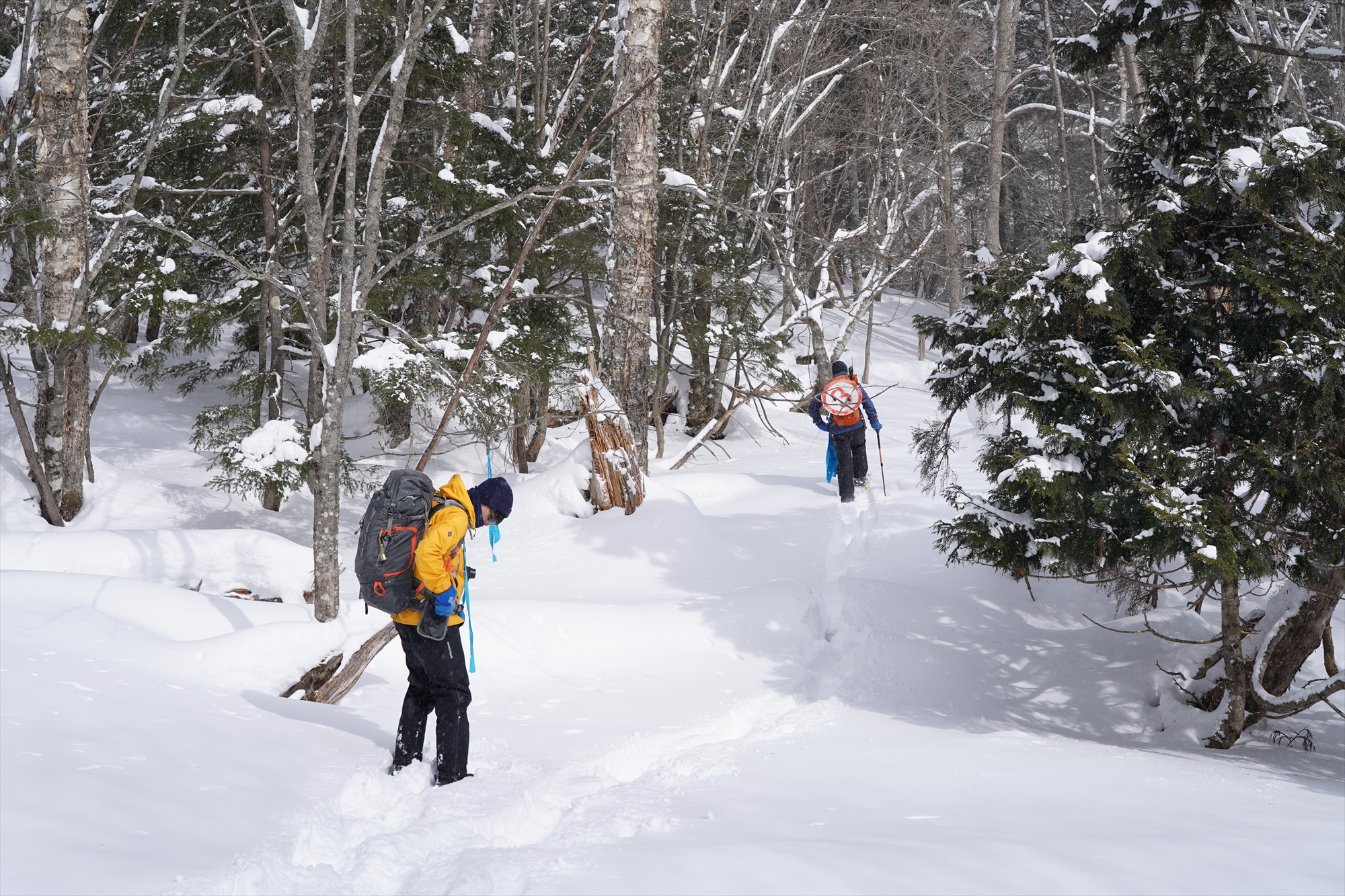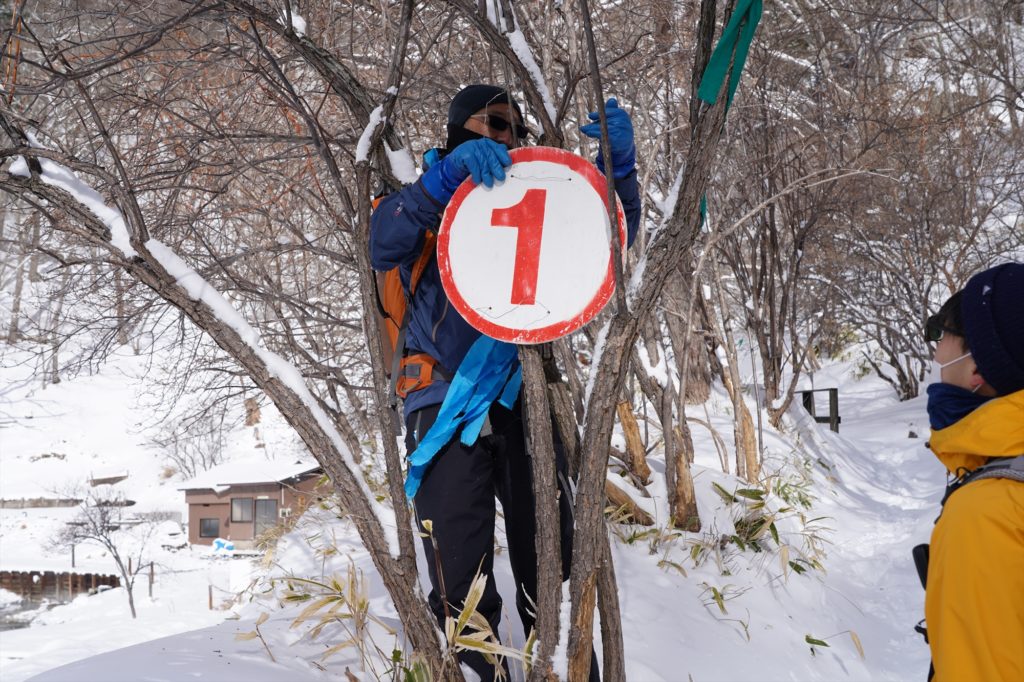一本道もあれば、だだっ広い森の中を抜けるルートもあります。そんな中を迷わないように、コースリボンや看板で目印をつけていきます。踏み跡はほとんどなかったため、まっさらな雪原をラッセル(=雪をかきわけ踏みわけ道を開くこと)する場面も多くありました。(これがなっかなかの重労働なんです……)