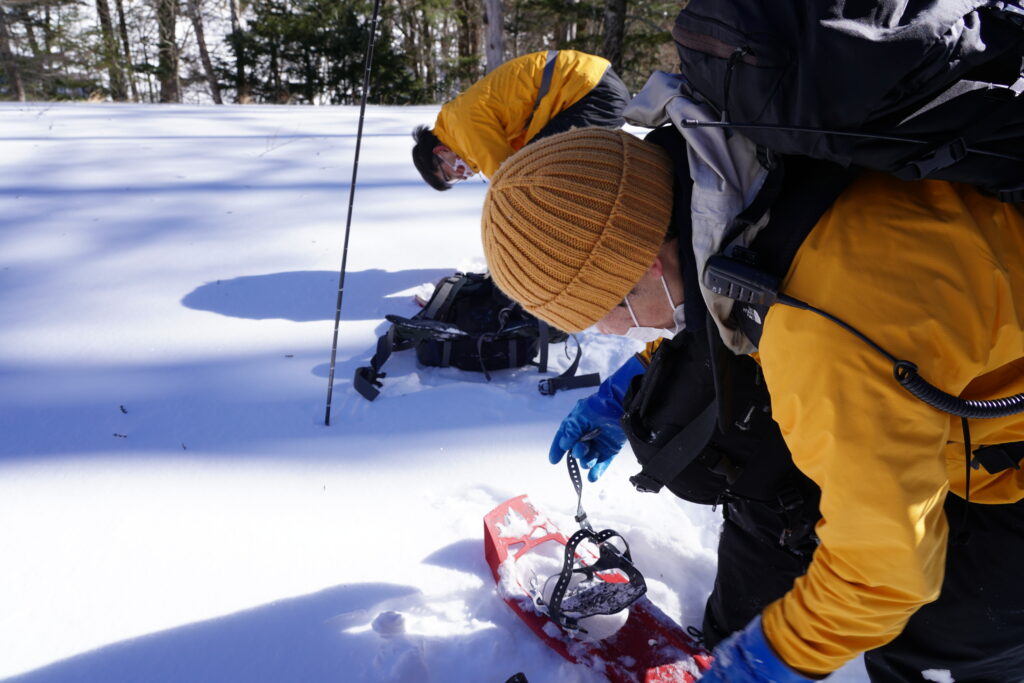 最後に当日行う予定の種目のひとつ「スノーシューで徒競走!」の練習風景をご紹介。