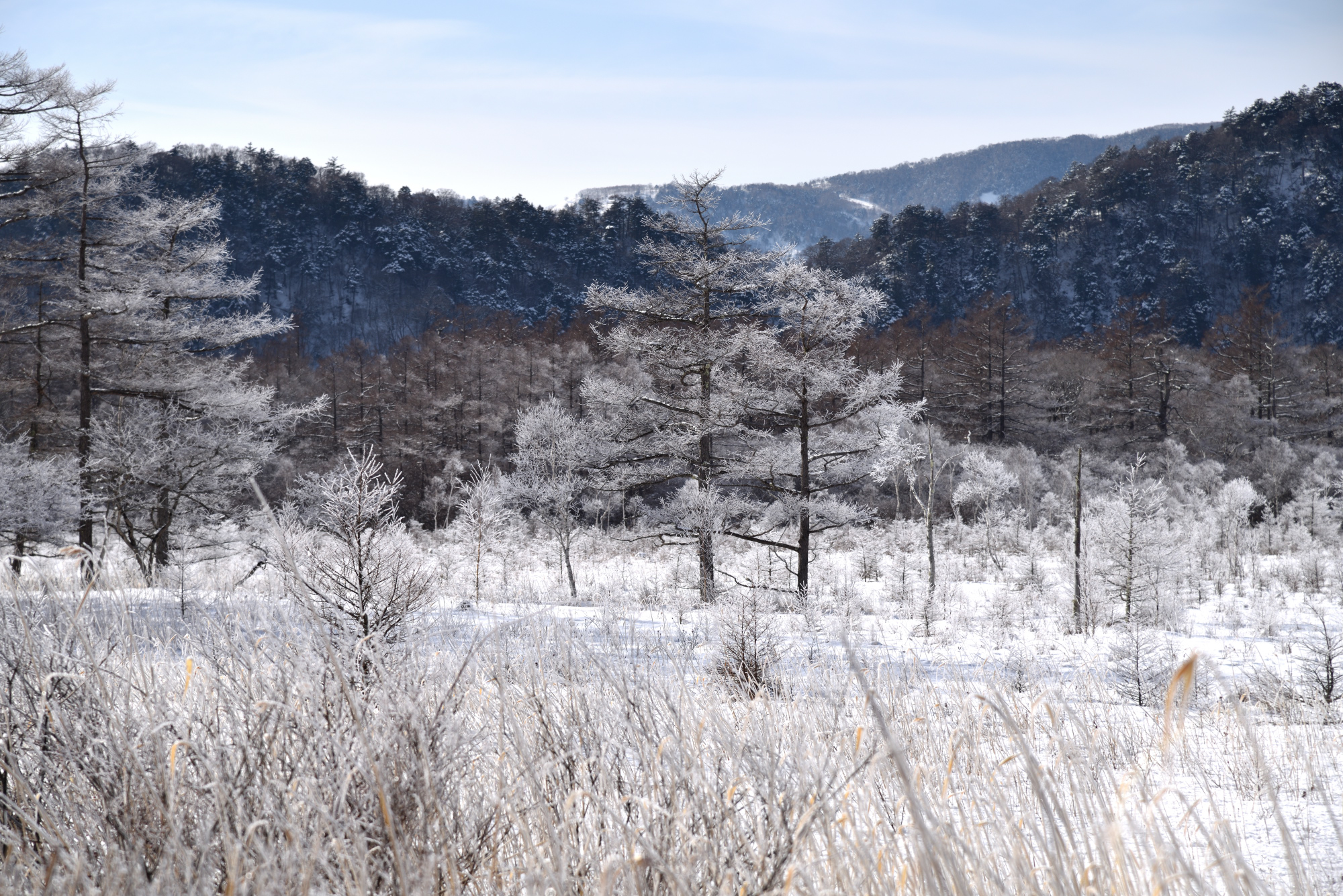 晴れた夜には戦場ヶ原では放射冷却が起き、一気に冷え込みます。そこに湿度の高さが加わると、霧氷が発生します。今回は、夜間の寒さに加え、前日月曜は良く晴れて暖かかったため、日中に雪が解けて空気中の湿度が高まっていたのかな、と予想。