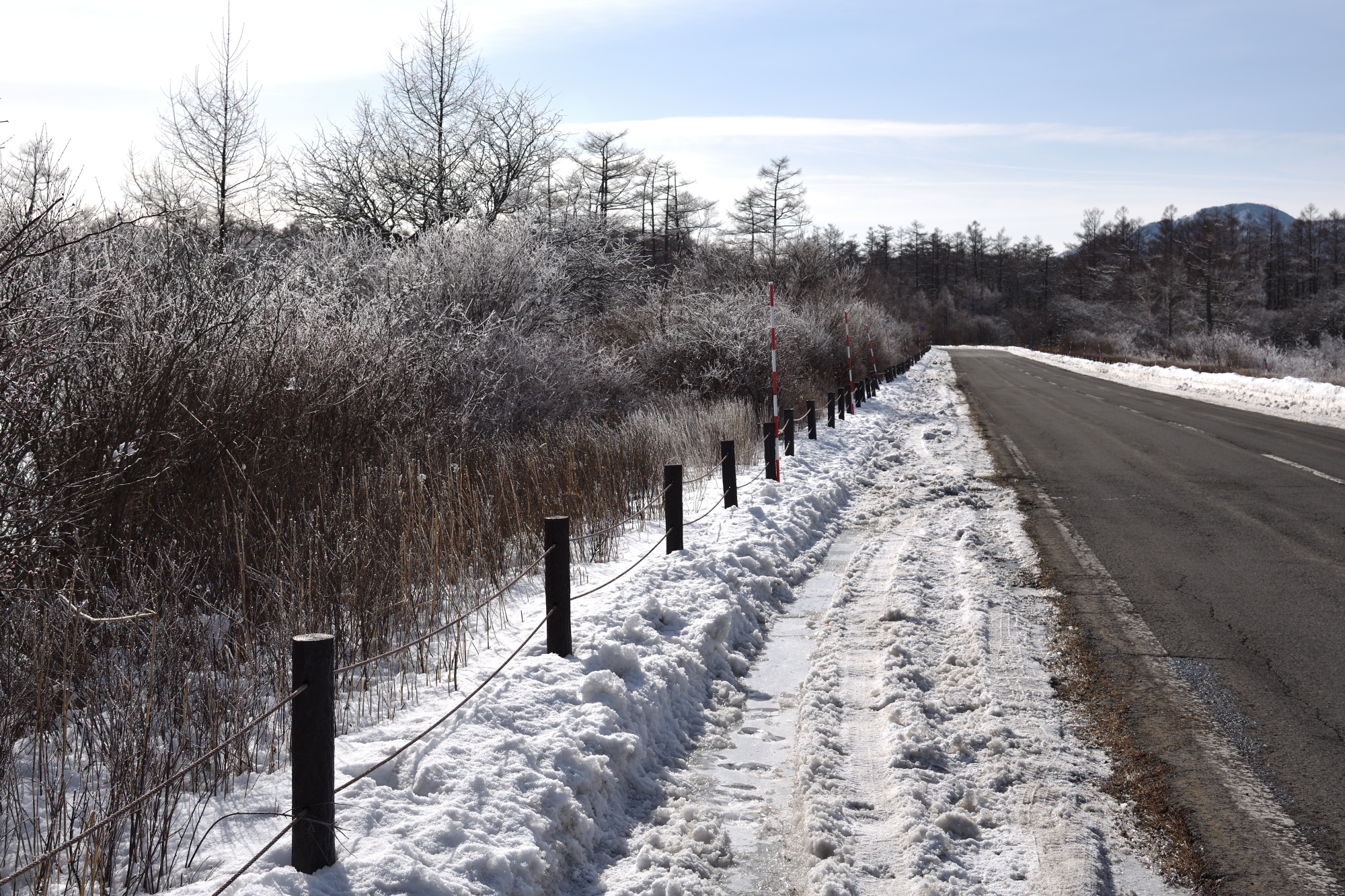 (遊歩道の積雪も踏み固められていて、スノーシューは不要です。国道同様に圧雪の表面の凍結が心配されるため、同じくチェーンスパイクなどの滑り止めがあると安心。)