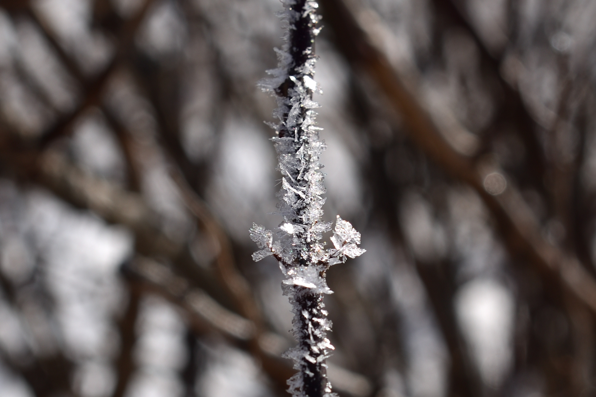 枝などに、雪の結晶のような形の薄い氷がたくさんくっついているのが見てとれます。
