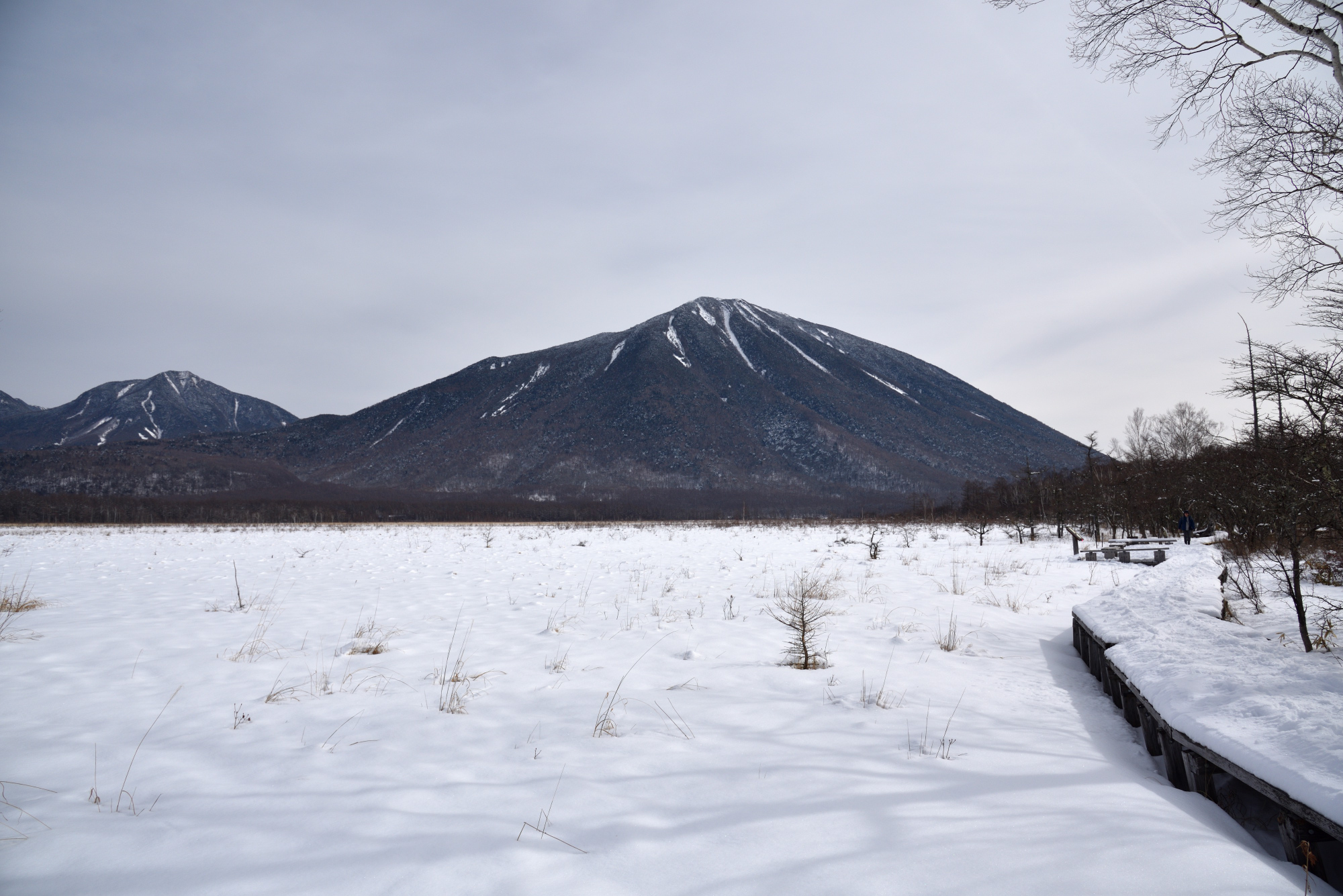 イネ科など湿原の草が埋まって、一面真っ白!越しの男体山!