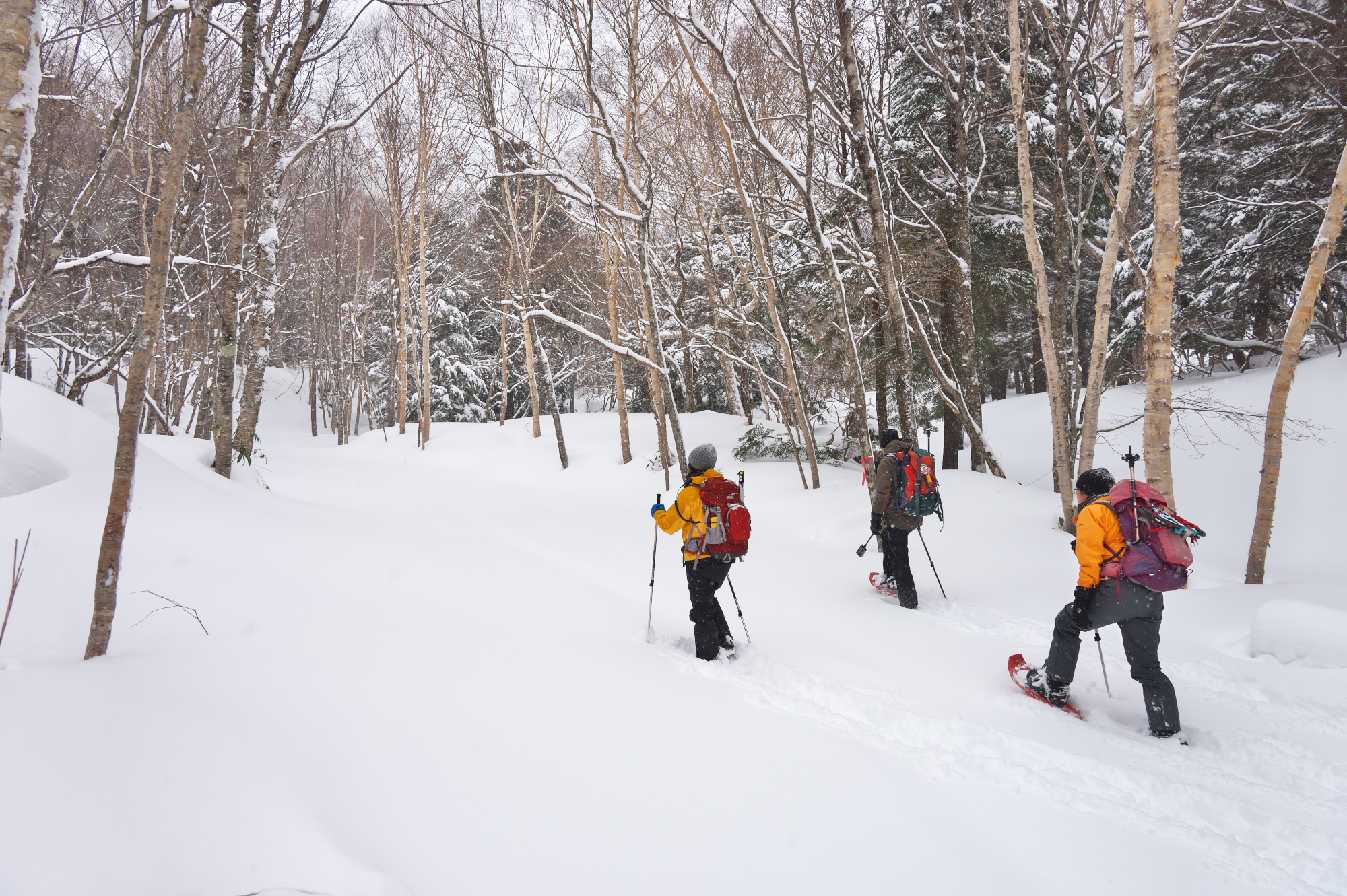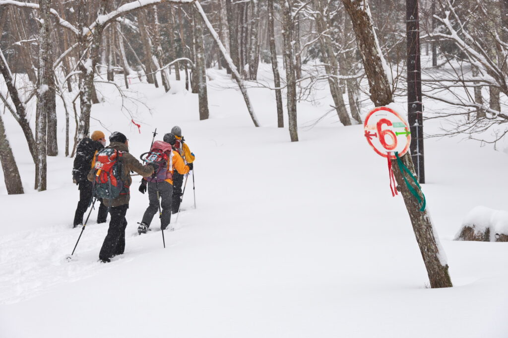 湯元ではスノーシューコースが整備され、コースごとにリボンが色分けされ木々に付けられています。
