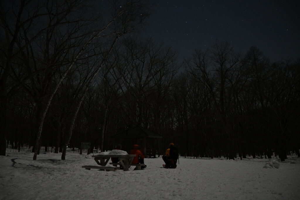 開けた所に出ると星空観察も楽しめます!この日の天気は晴れ、気温は氷点下までは下がらず風もないと、とても良い条件に恵まれました。