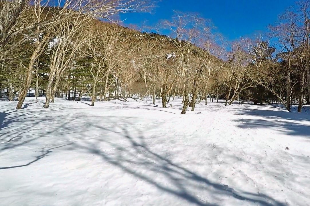 スノーシューコース②より先は、全体的に固いクラストでスノーシューがなくてもほとんど沈まず。