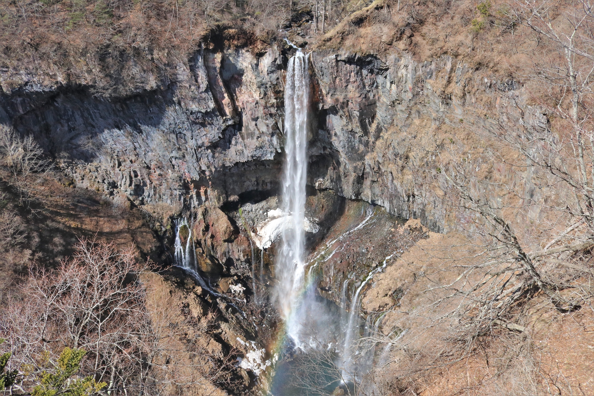 雪はほとんどなく、日陰になりやすい斜面や滝つぼの上あたりに残っている程度。