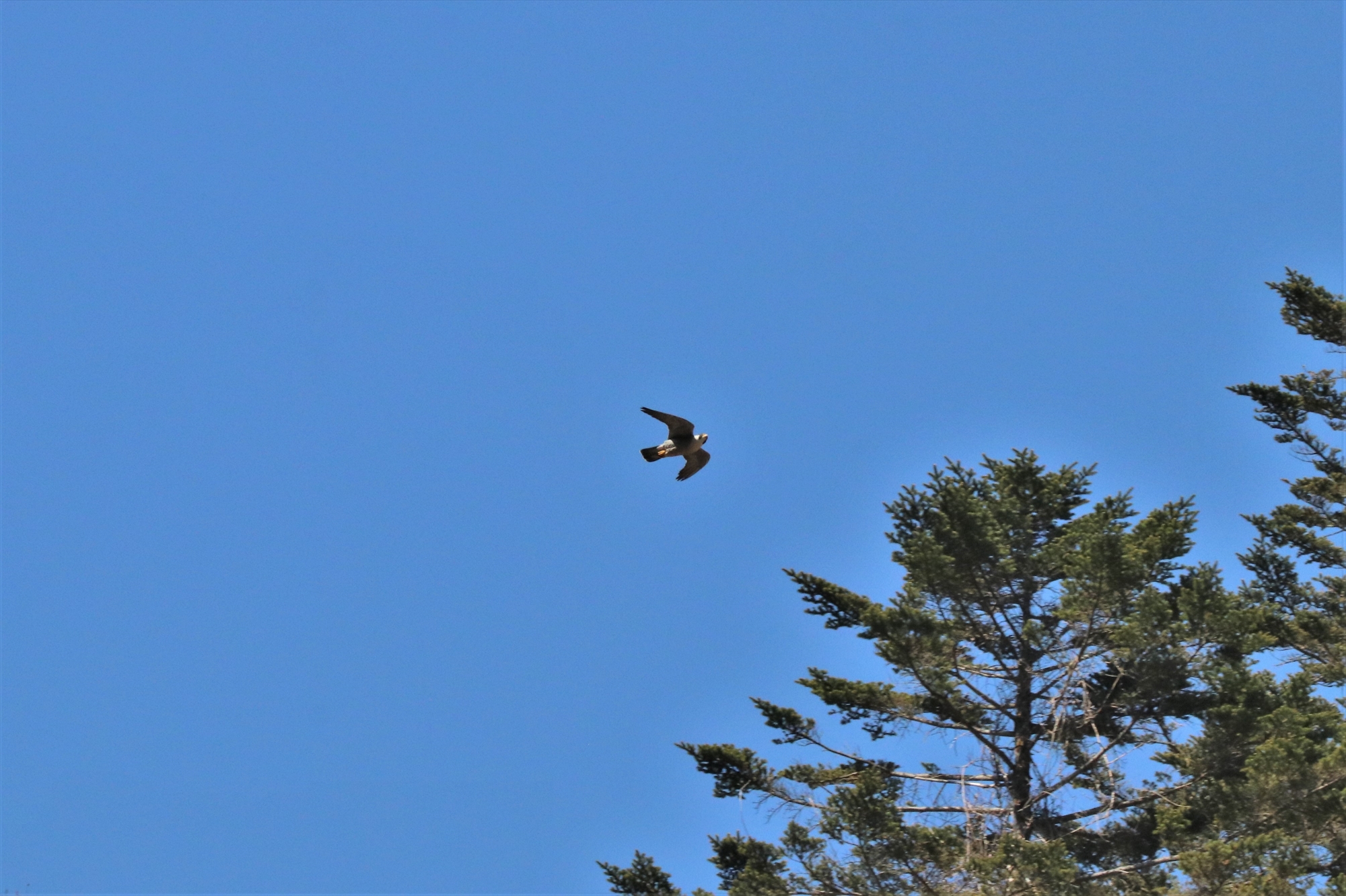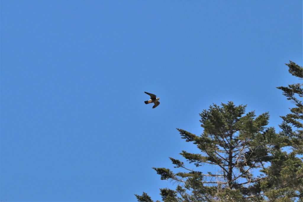 ブーメランのような特徴的な羽と黄色い嘴からハヤブサであることが分かりました。ハヤブサで動物食でスズメやハトなどの鳥類を主食としています。恐らく、イワツバメたちもここでは獲物であり、ハヤブサの存在に気付いて逃げたのだと思います。