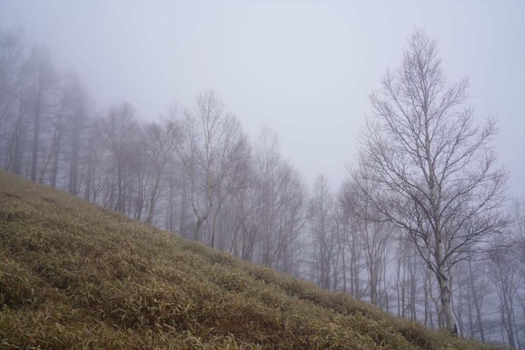 本日(4月14日)の天気は小雨と深い霧。残雪はないものの地面にはぬかるみが多いため、数日は登山靴に加えスパッツを用意し、転倒や泥汚れへの対策が必要になりそうです。