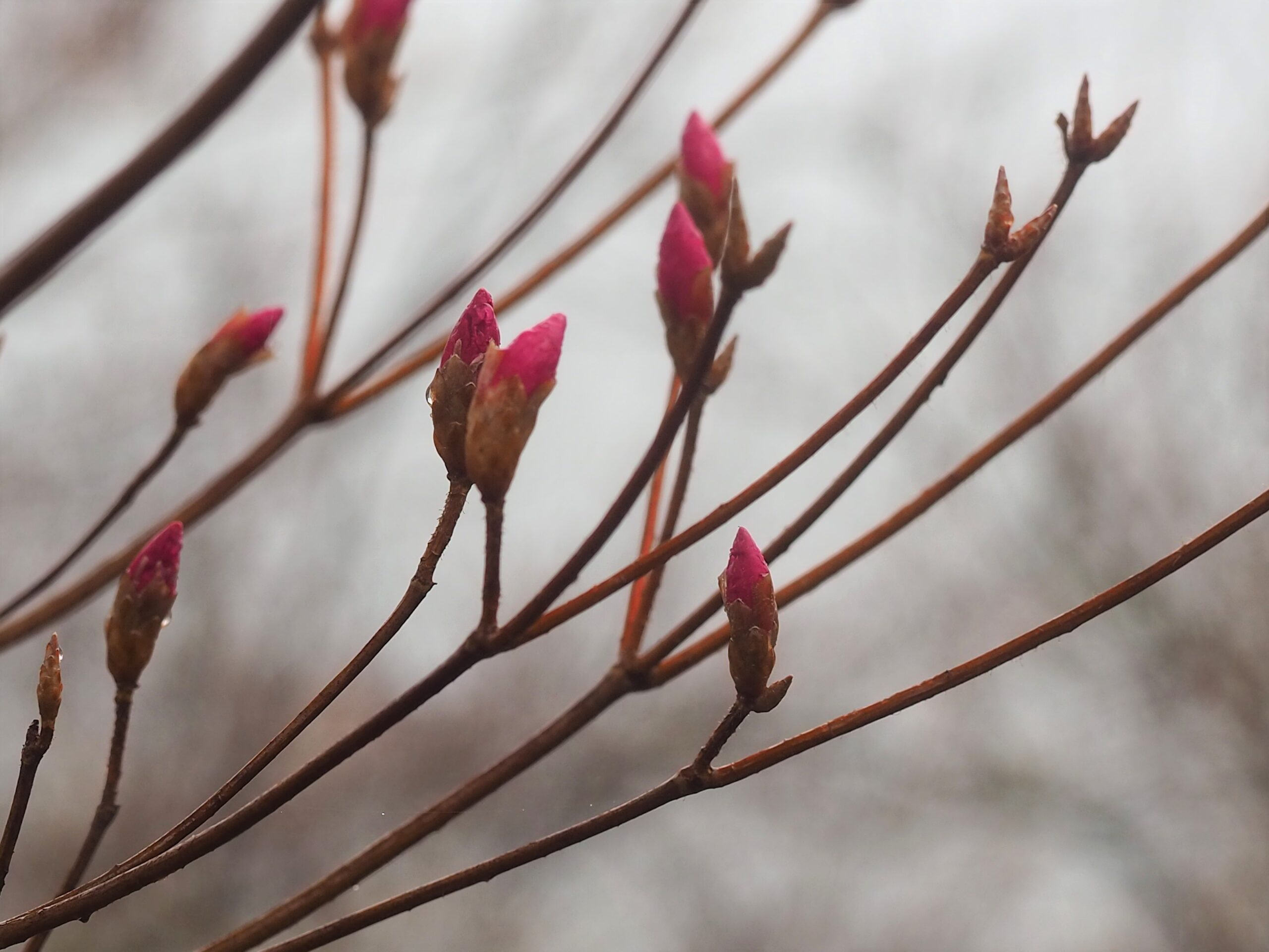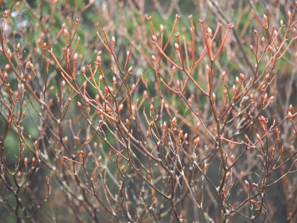 暖かい日が続き、例年より一週間ほど早い開花が予想されているアカヤシオ。