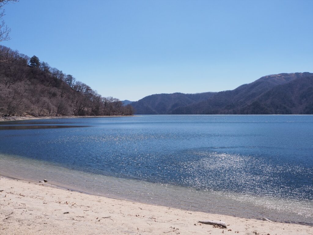快晴の青、湖の青、砂浜の白のコントラストが濃い!