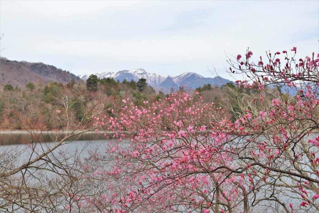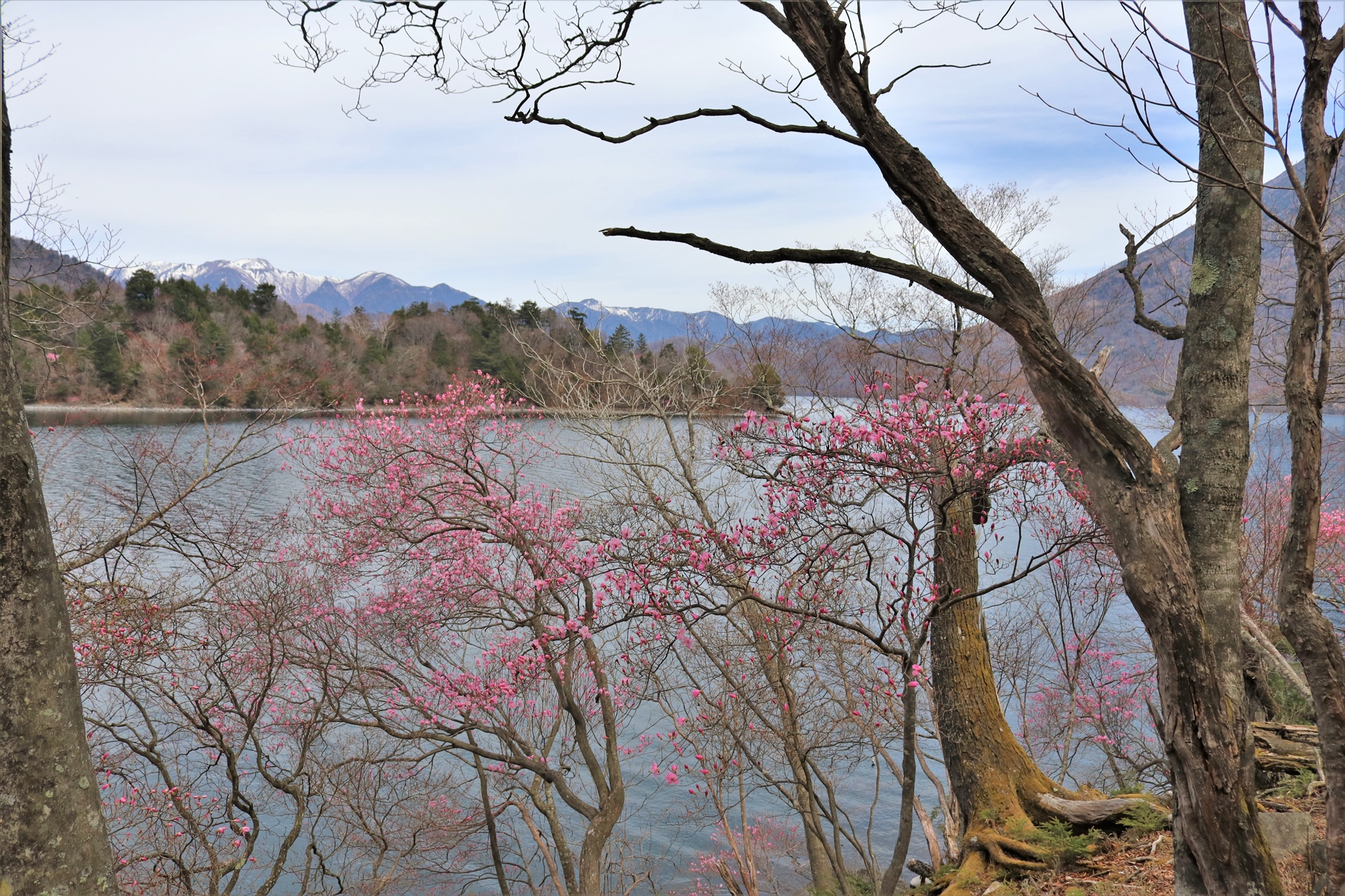 イタリア大使館別荘記念公園を過ぎて狸窪まで行く途中の湖畔では、アカヤシオが見頃に入りつつありました。