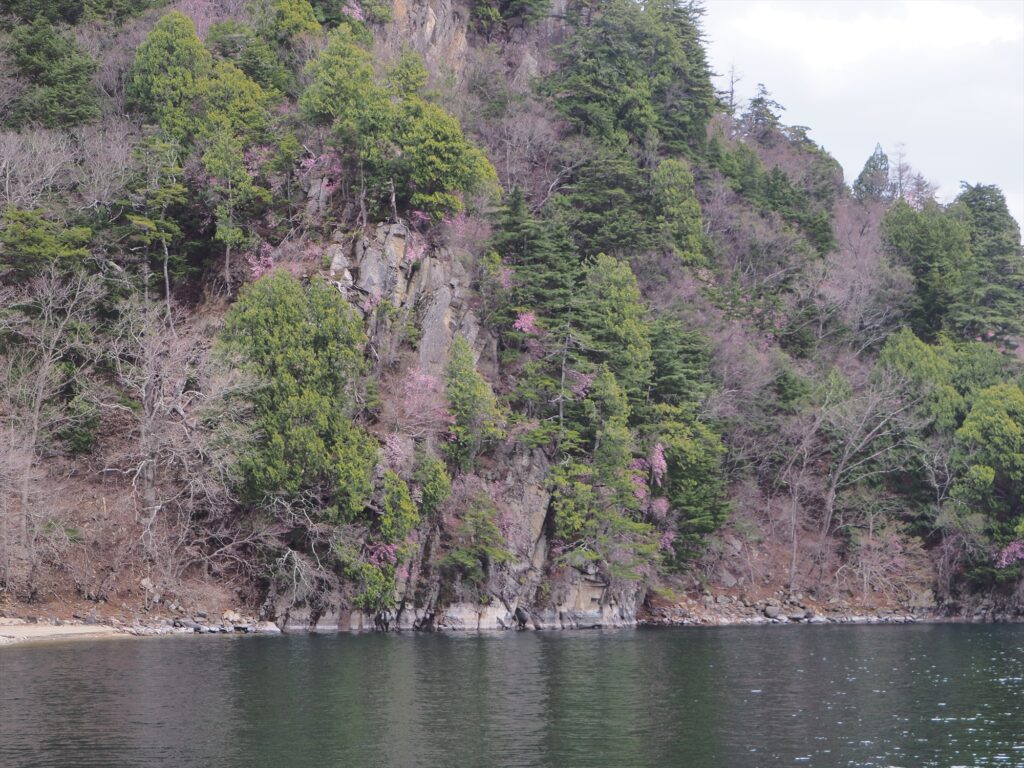 赤岩に近寄ってみます。(岩壁の木には近づけないので、遊歩道の近くの木を見に行っていますよ!)