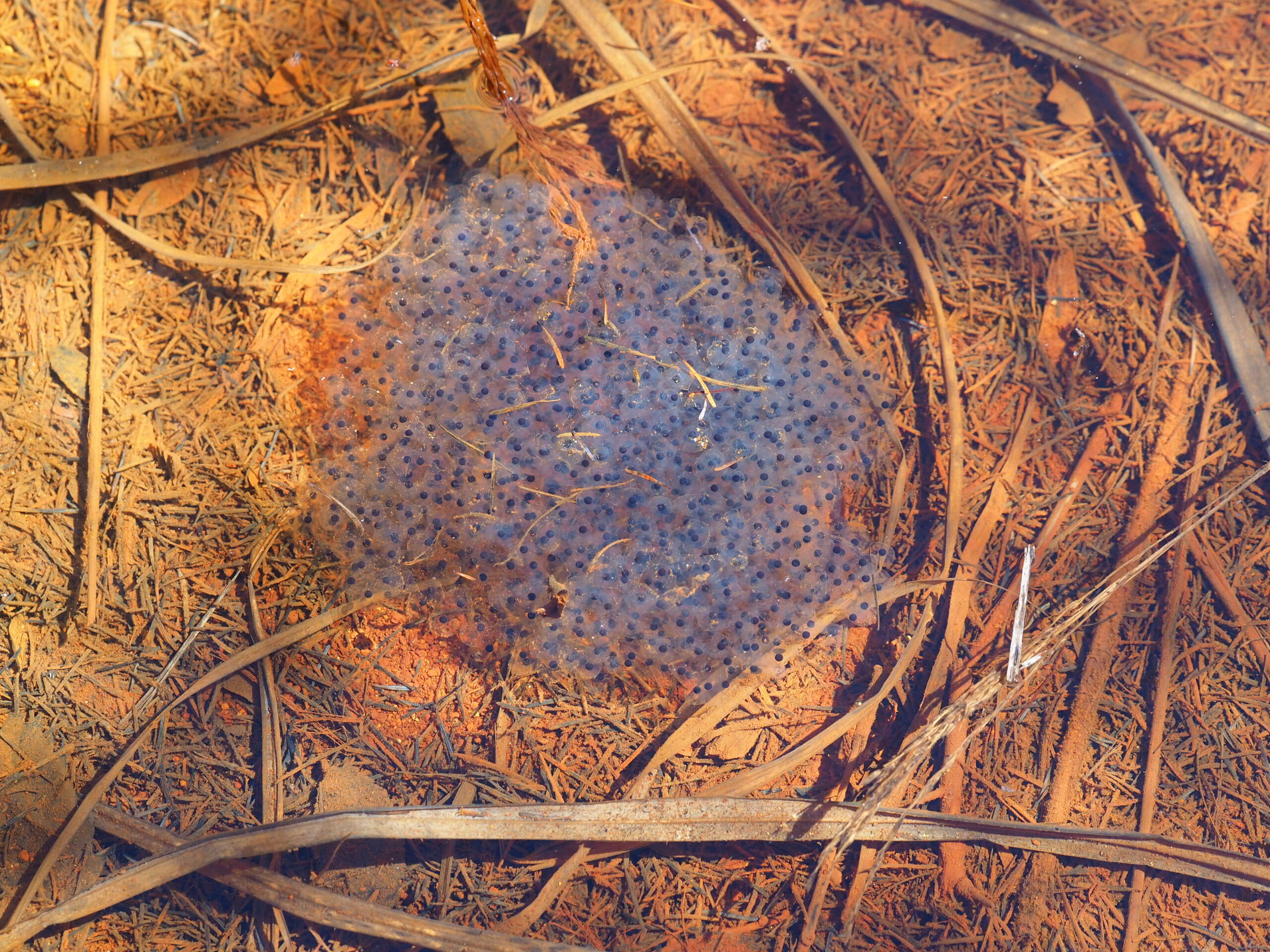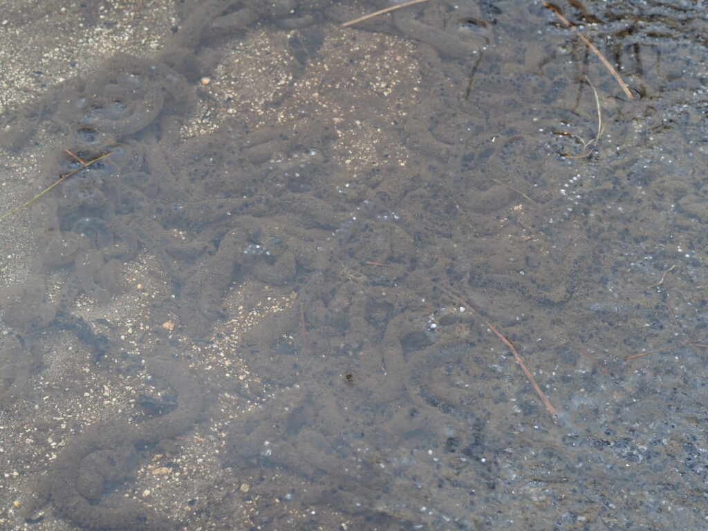 その正体はアズマヒキガエルの卵塊で、中の黒い粒は卵なのです。この光徳沼周辺はアズマヒキガエルの繁殖場所の一つであり、多くのカエルが集まりオスがメスを取り合うガマ合戦が行われます。しかし水中に卵塊が多く、周囲にカエルの姿が見当たらないことから、残念ながらこの場所でのガマ合戦は既に終わったと思われます。