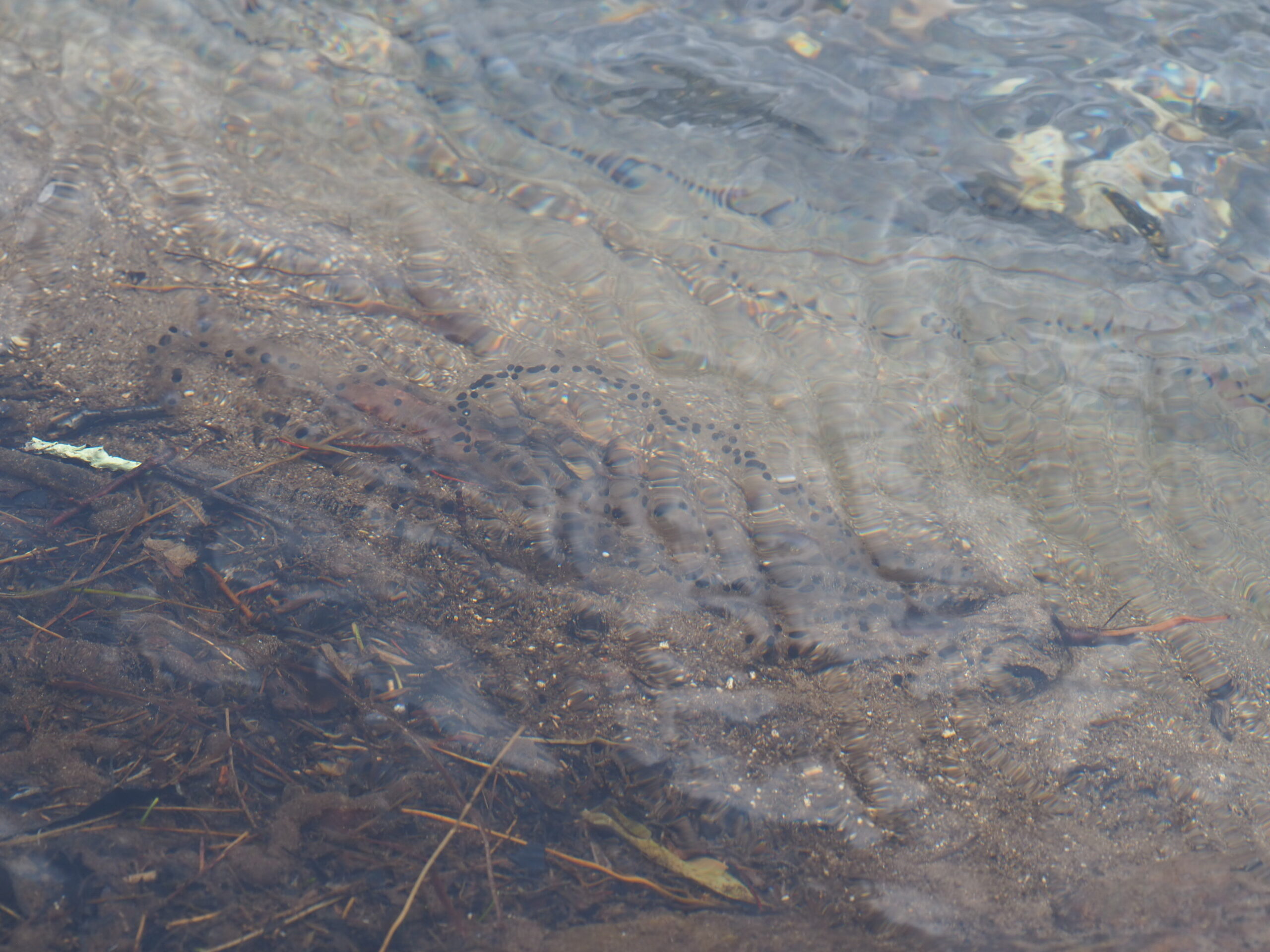 流水中にあった卵塊は、流れのおかげで彼らの天敵であるヘビのような格好に。藻や泥が付着していない卵塊はこのように透明です。