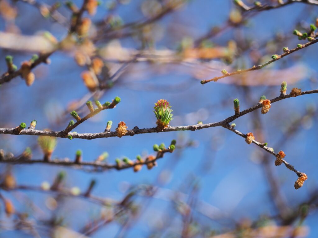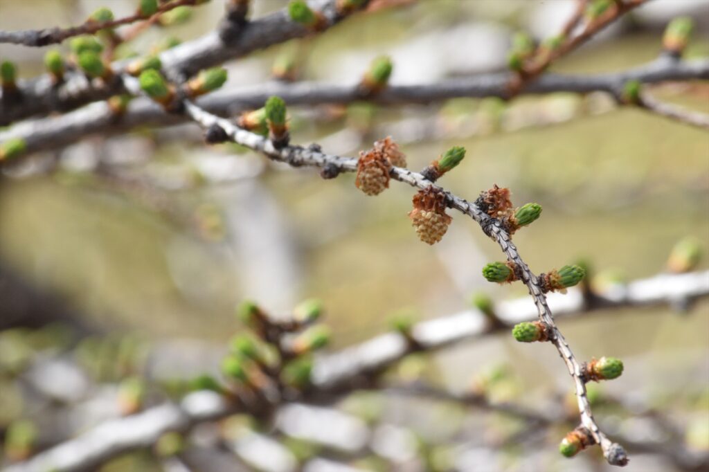 カラマツの雄花が咲いていました!淡い黄色で周りの葉っぱの黄緑色に映えて、可愛らしかったです。
