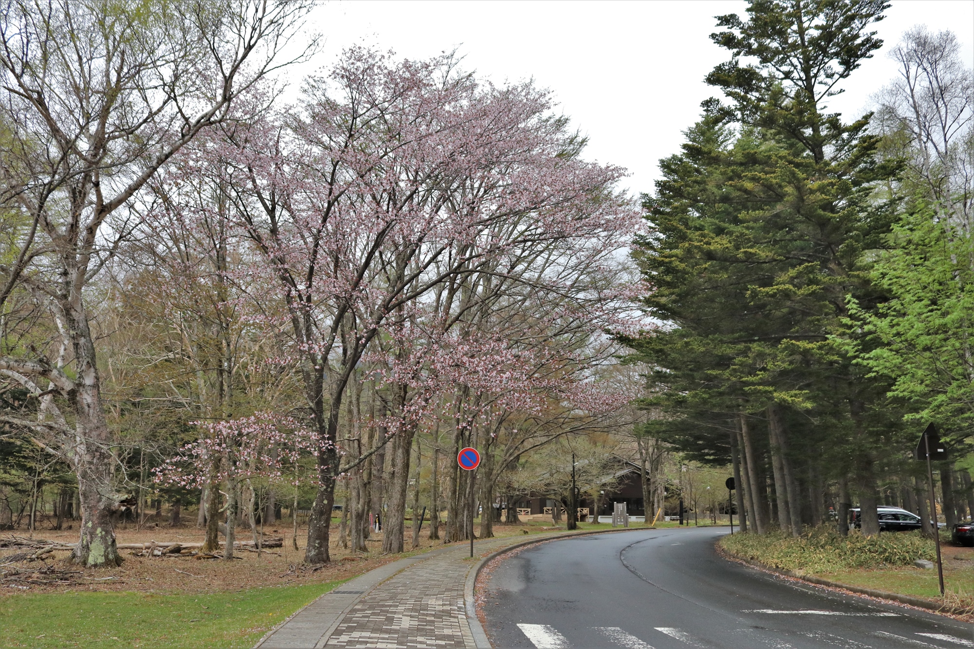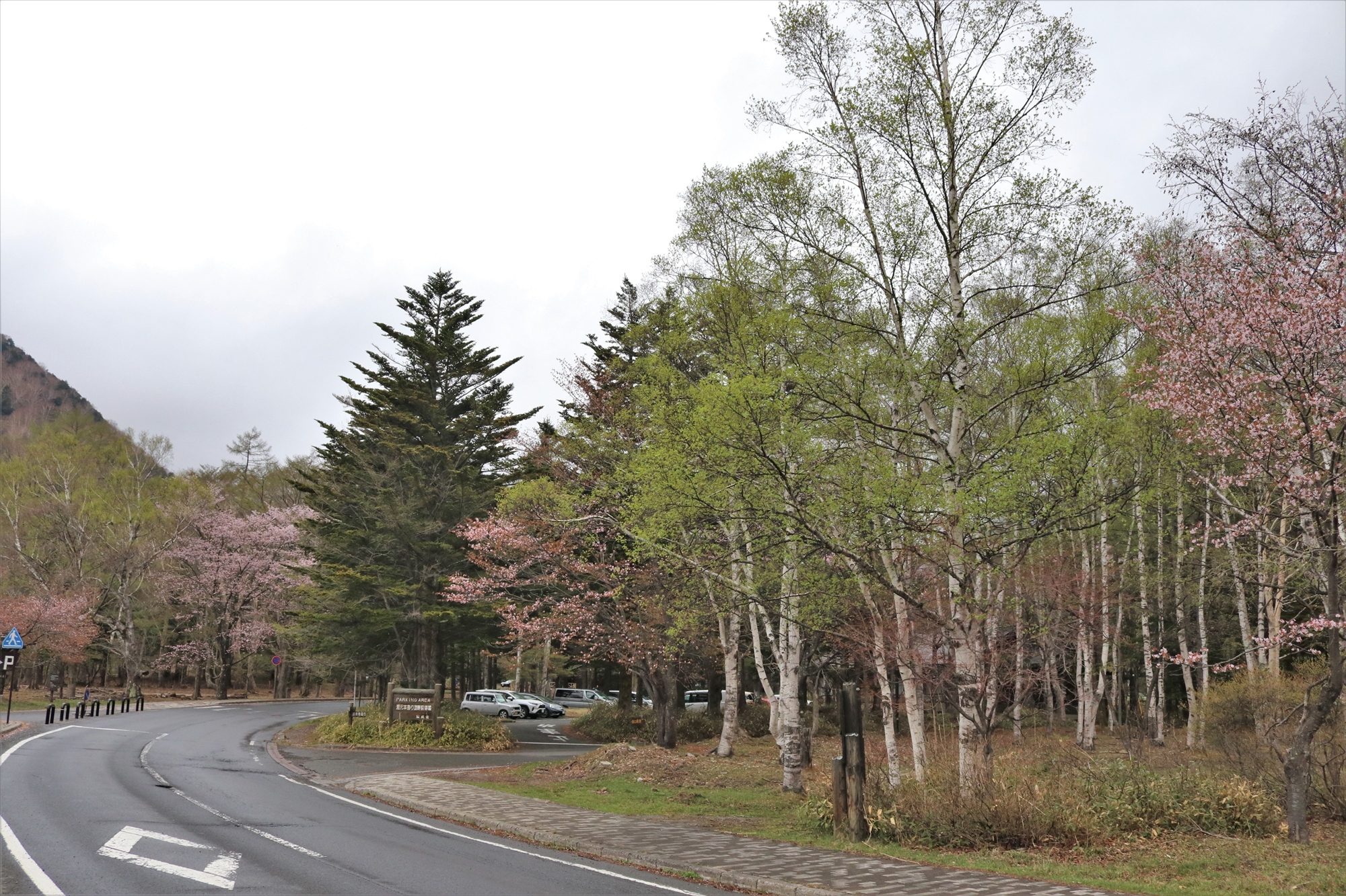 シラカンバの新緑やカラマツの新芽が目立つようになってきていました。少しずつ新緑に染まり始めるこの時期の景色はわくわくしますね。また、新緑とともに華やかな桃色で彩られる湯元の街中。