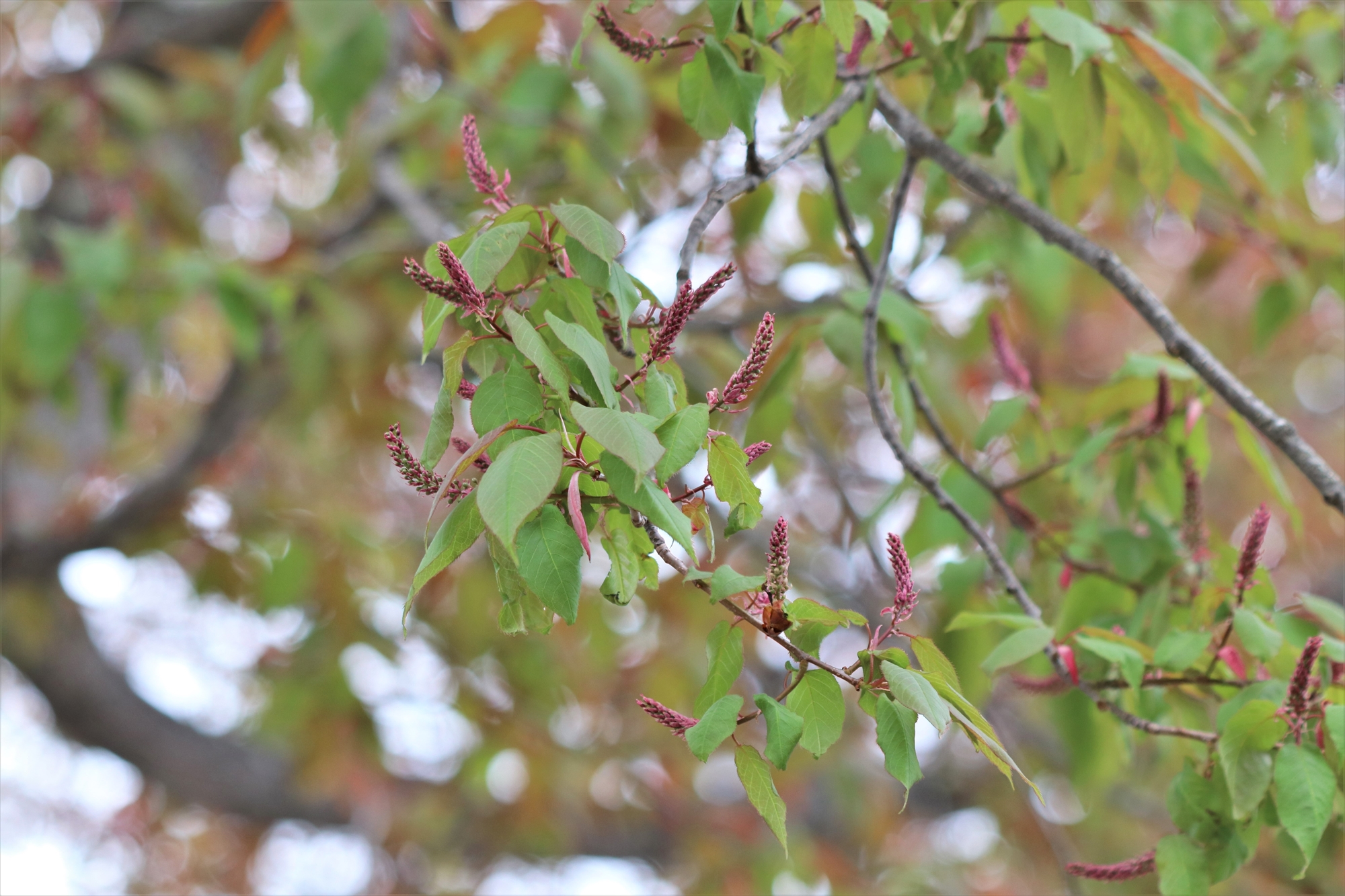 こちらはちょっと遅めで6月上旬ごろに開花します。花も桃色のサクラらしい形ではなく、たくさんの小さな白い花がブラシ状に細長くつきます。
