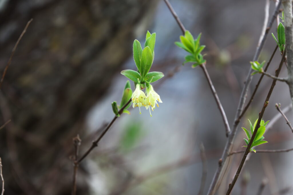 どちらも下を向いた小さい花をつける低木ですが、ラッパのように反り返った濃いピンク色の花と白に近い薄黄色の花とで雰囲気がまったく違います。また、ミヤマウグイスカグラは湿原より林側に多いですが、クロミノウグイスカグラは湿原側に多いです。