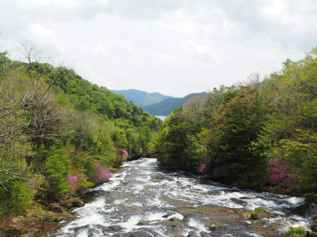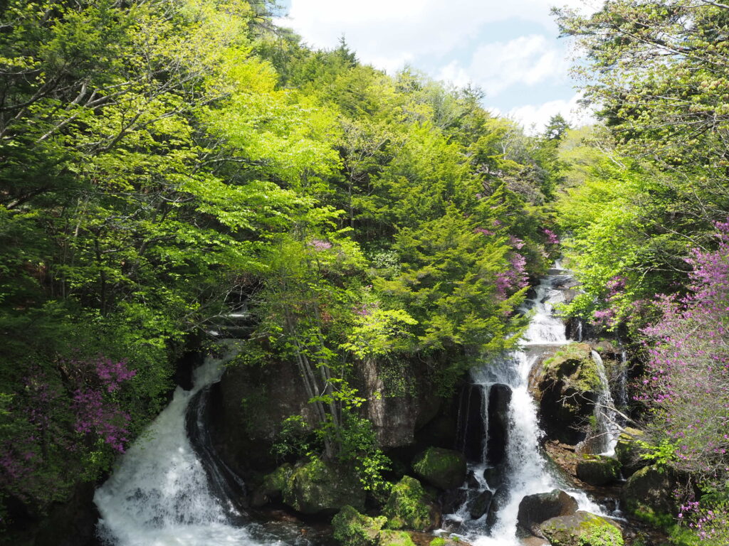 竜頭滝のトウゴクミツバツツジは、正面、階段横、滝上、どこも見頃を迎えています。