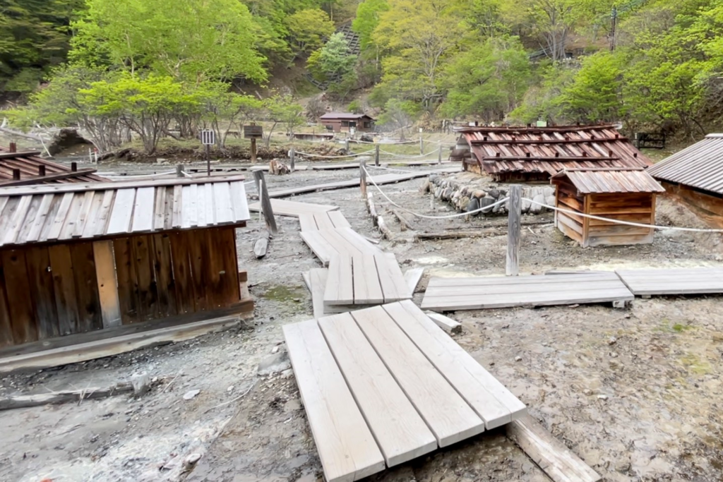 日光湯元温泉の泉源であり、あちこちから熱い温泉が湧き、水溜まりもといお湯溜まりが出来ています。